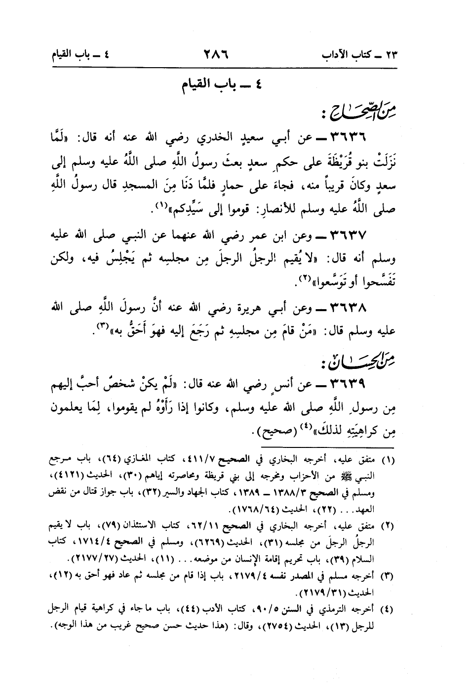 (¬4) أخرجه الترمذي في السنن 5/ 90، كتاب الأدب (44)، باب ما جاء في كراهية قيام الرجل للرجل (13)، الحديث (2754)، وقال: (هذا حديث حسن صحيح غريب من هذا الوجه).