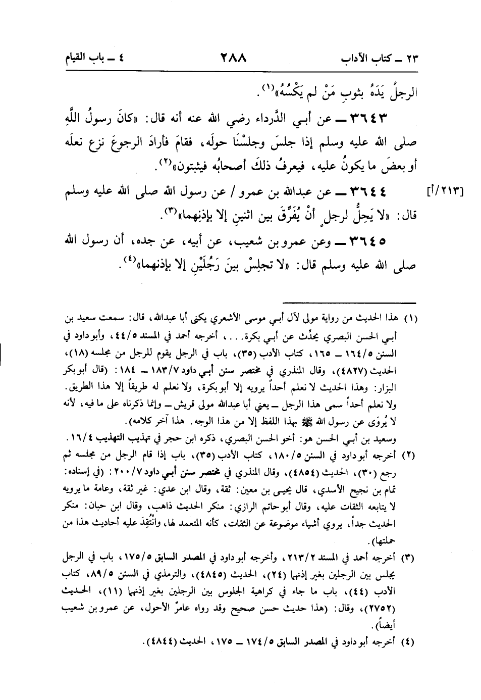 3645 - وعن عمرو بن شعيب، عن أبيه، عن جده، أن رسول اللَّه صلى اللَّه عليه وسلم قال: "لا تجلِسْ بينَ رَجُلَيْنِ إلّا بإذنهما" (¬4).