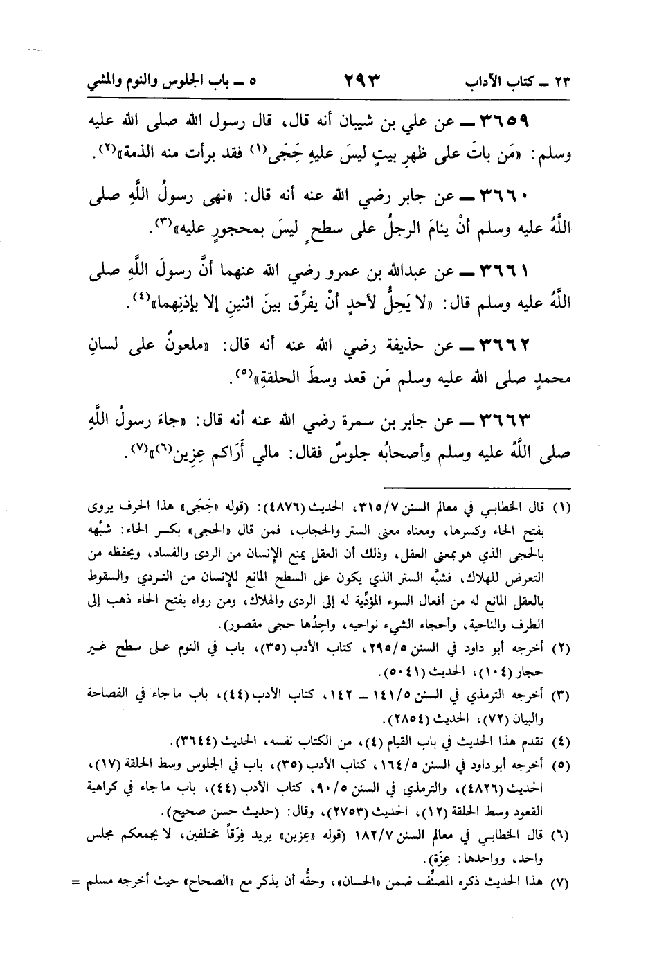 (¬1) قال الخطابي في معالم السنن 7/ 315، الحديث (4876): (قوله "حَجَى" هذا الحرف يروى بفتح الحاء وكسرها، ومعناه معنى الستر والحجاب، فمن قال "الحجى" بكسر الحاء: شبَّهه بالحجى الذي هو بمعنى العقل، وذلك أن العقل يمنع الإِنسان من الردى والفساد، ويحفظه من التعرض للهلاك، فشبَّه الستر الذي يكون على السطح المانع للإِنسان من التردي والسقوط بالعقل المانع له من أفعال السوء المؤدِّية له إلى الردى والهلاك، ومن رواه بفتح الحاء ذهب إلى الطرف والناحية، وأحجاء الشيء نواحيه، واحِدُها حجى مقصور).