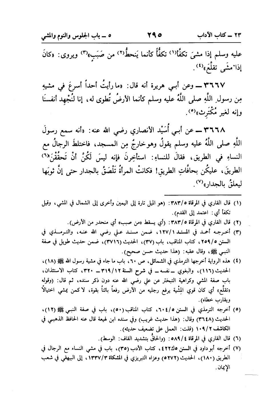 (¬4) هذه الرواية أخرجها الترمذي في الشمائل، ص 60، باب ما جاء في مشية رسول اللَّه -صلى اللَّه عليه وسلم- (18)، الحديث (116)، والبغوي -نفسه- في شرح السنة 12/ 319 - 320، كتاب الاستئذان، باب صفة المشي وكراهية التبختر عن علي رضي اللَّه عنه دون ذكر سنده، ثمَّ قال: (وقوله "تقلَّع" أي كان قوي المِشْية يرفع رجليه من الأرض رفعًا بائنًا بقوة، لا كمن يمشي اختيالًا ويقارب خطاه).