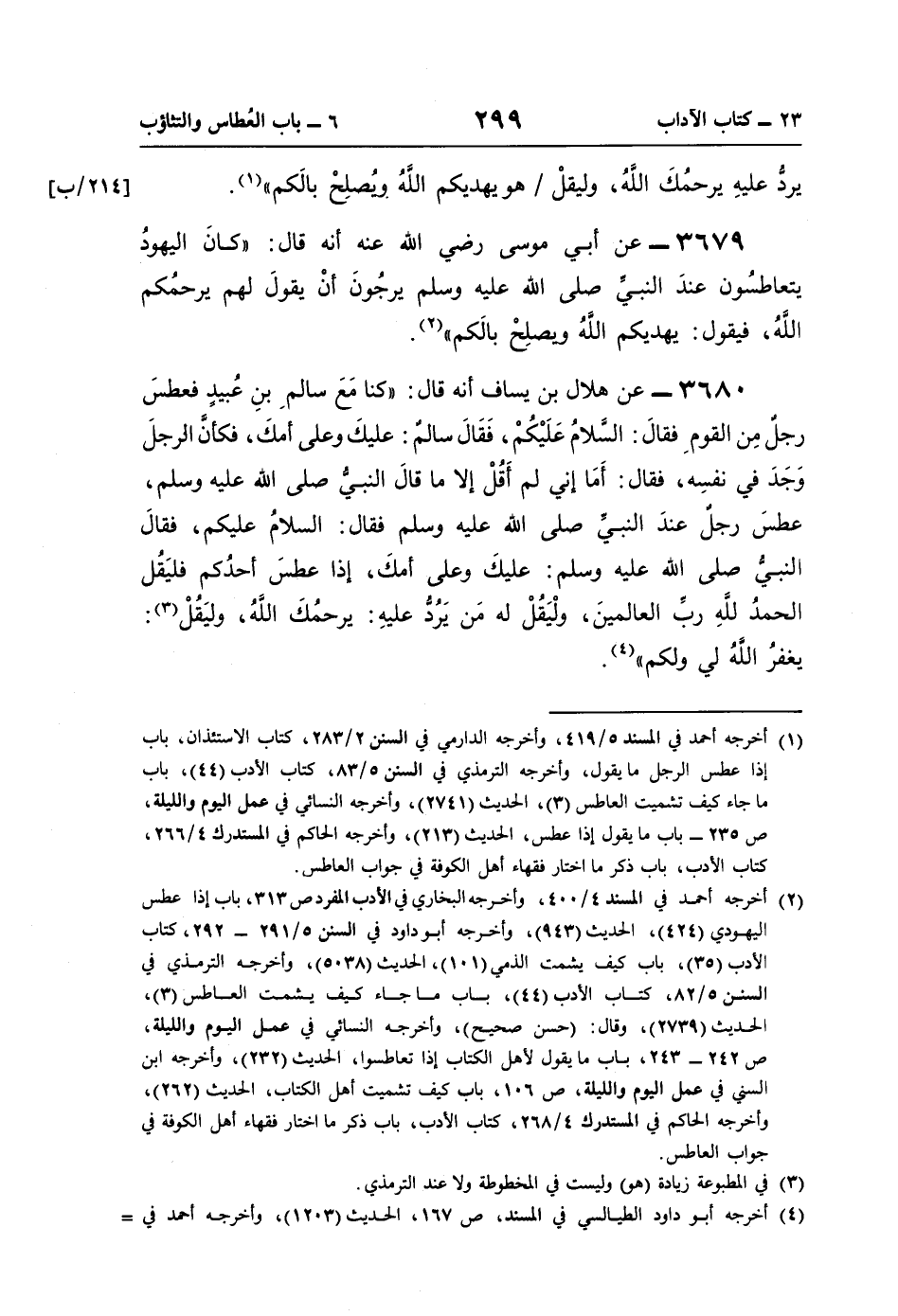 3679 - عن أبي موسى رضي اللَّه عنه أنّه قال: "كانَ اليهودُ يتعاطسُون عندَ النَّبيِّ صلى اللَّه عليه وسلم يرجُونَ أنْ يقولَ لهم يرحمُكم اللَّهُ، فيقول: يهديكم اللَّهُ ويصلِحْ بالَكم" (¬2).