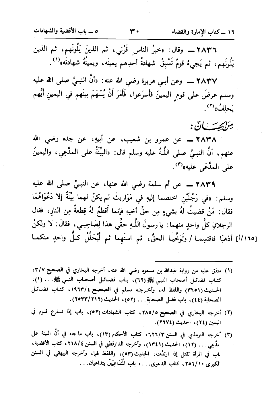 2838 - عن عمرو بن شعيب، عن أبيهِ، عن جده رضي اللَّه عنهم، أنَّ النبيَّ صلى اللَّهُ عليه وسلم قال: "البيِّنَةُ على المدَّعِي، واليمينُ على المدَّعَى عليه" (¬3).