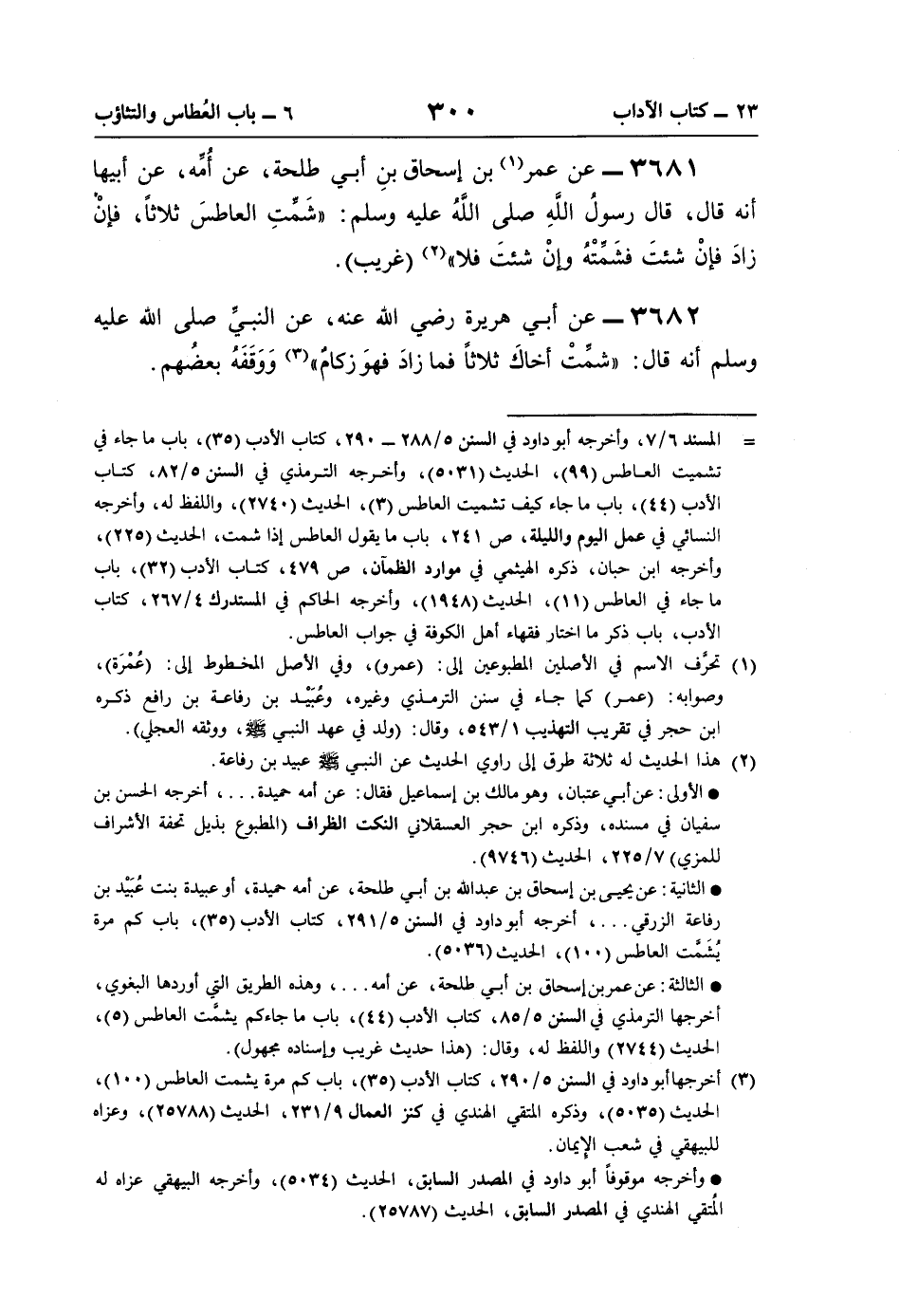 3681 - عن عمر (¬1) بن إسحاق بنِ أبي طلحة، عن أُمِّه، عن أبيها أنّه قال، قال رسولُ اللَّهِ صلى اللَّهُ عليه وسلم: "شَمِّتِ العاطسَ ثلاثًا، فإنْ زادَ فإنْ شئتَ فشَمِّتْهُ وإنْ شئتَ فلا" (¬2) (غريب).