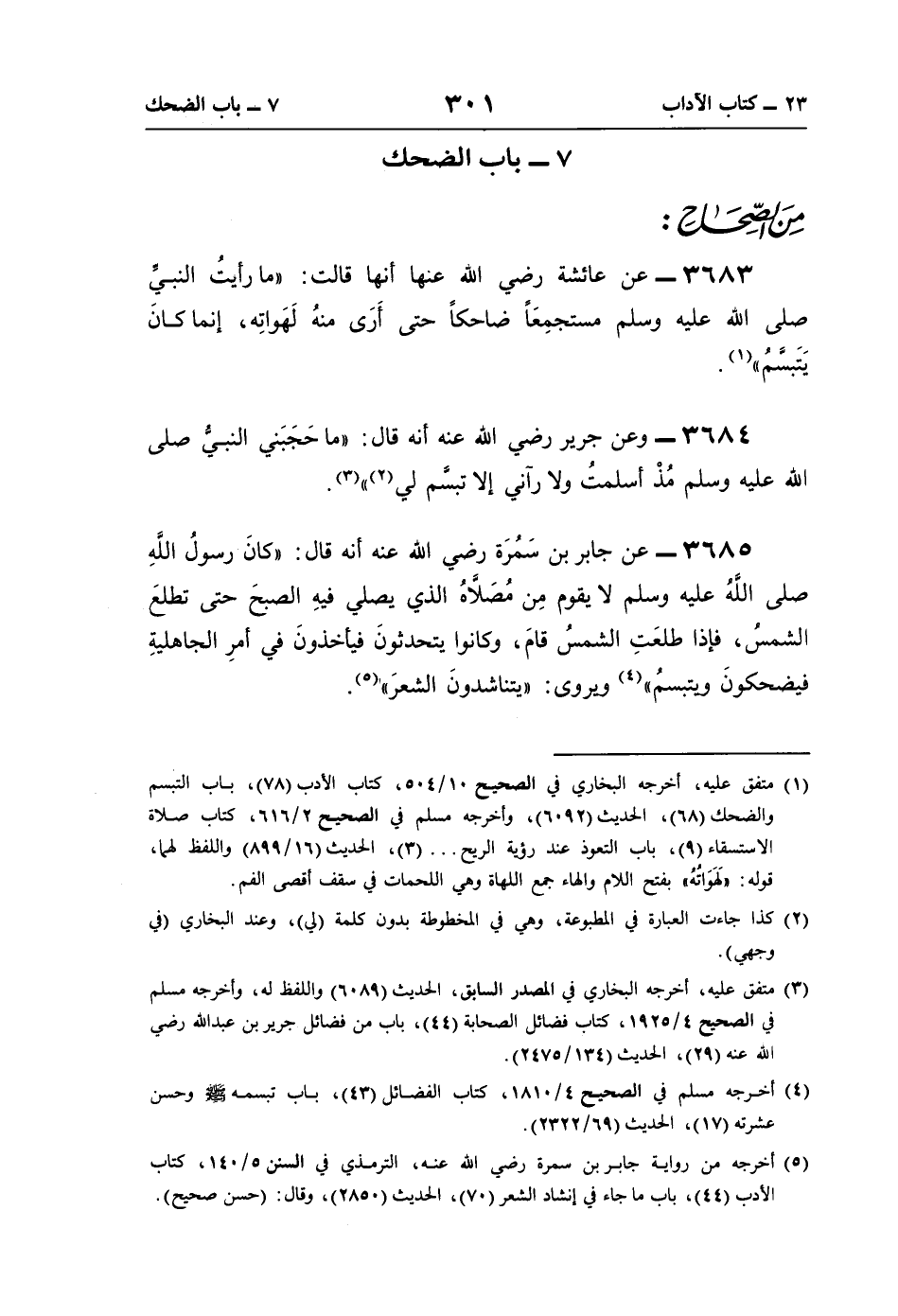 (¬4) أخرجه مسلم في الصحيح 4/ 1810، كتاب الفضائل (43)، باب تبسمه -صلى اللَّه عليه وسلم- وحسن عشرته (17)، الحديث (69/ 2322).