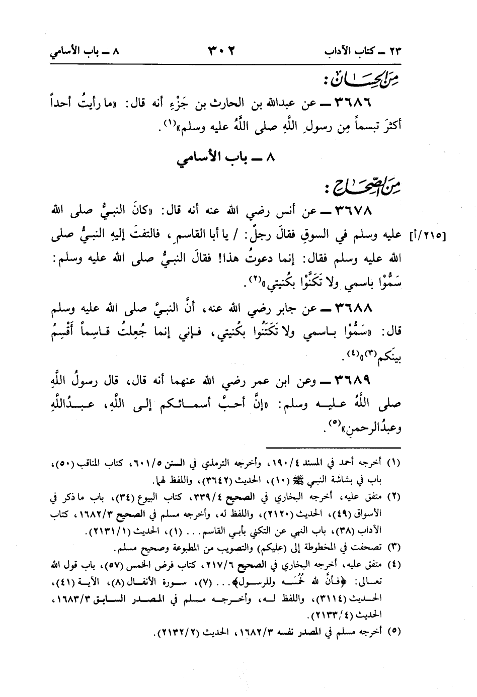 3678 - عن أنس رضي اللَّه عنه أنّه قال: "كانَ النبيُّ صلى اللَّه عليه وسلم في السوقِ فقالَ رجلٌ: يا أبا القاسمِ، فالتفتَ إليهِ النبيُّ صلى اللَّه عليه وسلم فقال: إنما دعوتُ هذا! فقالَ النبيُّ صلى اللَّه عليه وسلم: سَمُّوْا باسمي ولا تَكَنَّوْا بكُنيتي" (¬2).