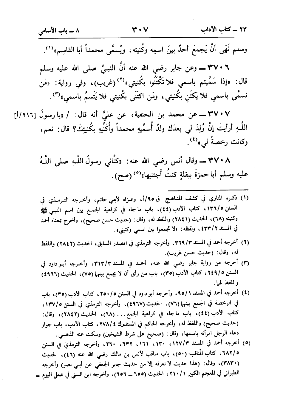 (¬3) أخرجه من رواية جابر رضي اللَّه عنه، أحمد في المسند 3/ 313، وأخرجه أبو داود في السنن 5/ 249، كتاب الأدب (35)، باب من رأى أن لا يجمع بينهما (75)، الحديث (4966) واللفظ لهما.