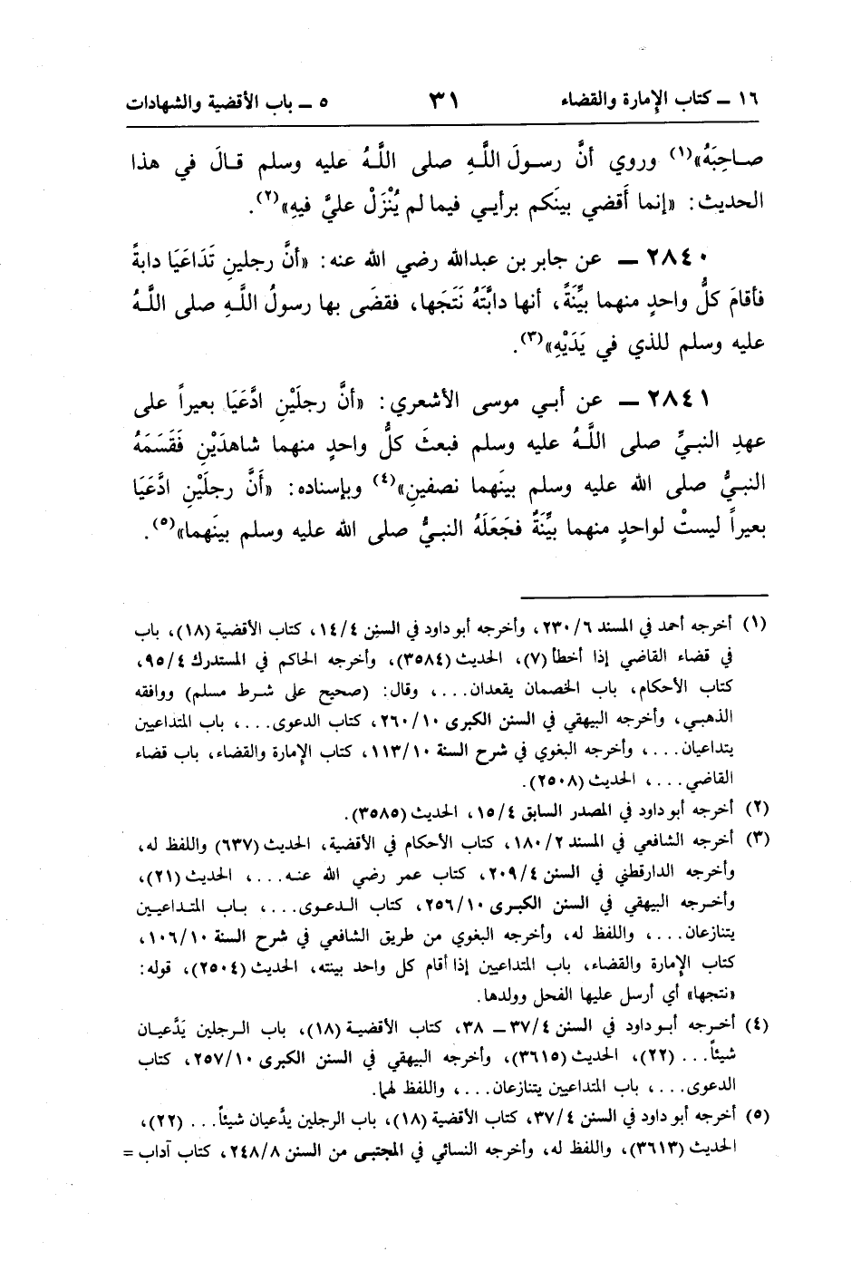 2840 - عن جابر بن عبد اللَّه رضي اللَّه عنه "أنّ رجلين تَدَاعَيَا دابةً فأقامَ كلُّ واحدٍ منهما بيِّنَةً، أنها دابَّتَهُ نَتَجَها، فقضَى بها رسولُ اللَّه صلى اللَّهُ عليه وسلم للذي في يَدَيْهِ" (¬3).