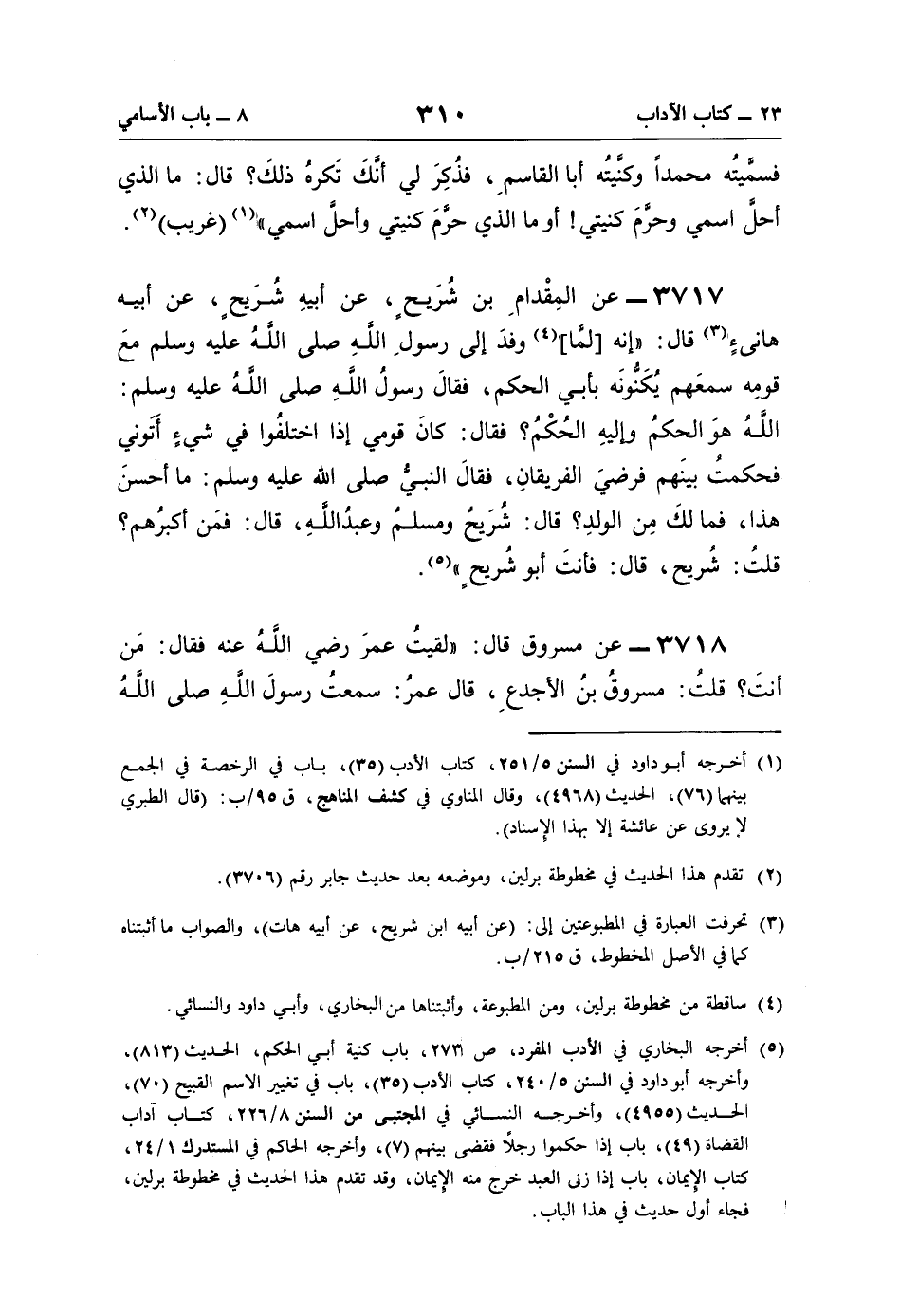 (¬5) أخرجه البخاري في الأدب المفرد، ص 273، باب كنية أبي الحكم، الحديث (813) , وأخرجه أبو داود في السنن 5/ 240، كتاب الأدب (35)، باب في تغيير الاسم القبيح (70)، الحديث (4955)، وأخرجه النسائي في المجتبى من السنن 8/ 226، كتاب آداب القضاة (49)، باب إذا حكموا رجلًا فقضى بينهم (7)، وأخرجه الحاكم في المستدرك 1/ 24، كتاب الإيمان، باب إذا زنى العبد خرج منه الإيمان، وقد تقدم هذا الحديث في مخطوطة برلين، فجاء أول حديث في هذا الباب.