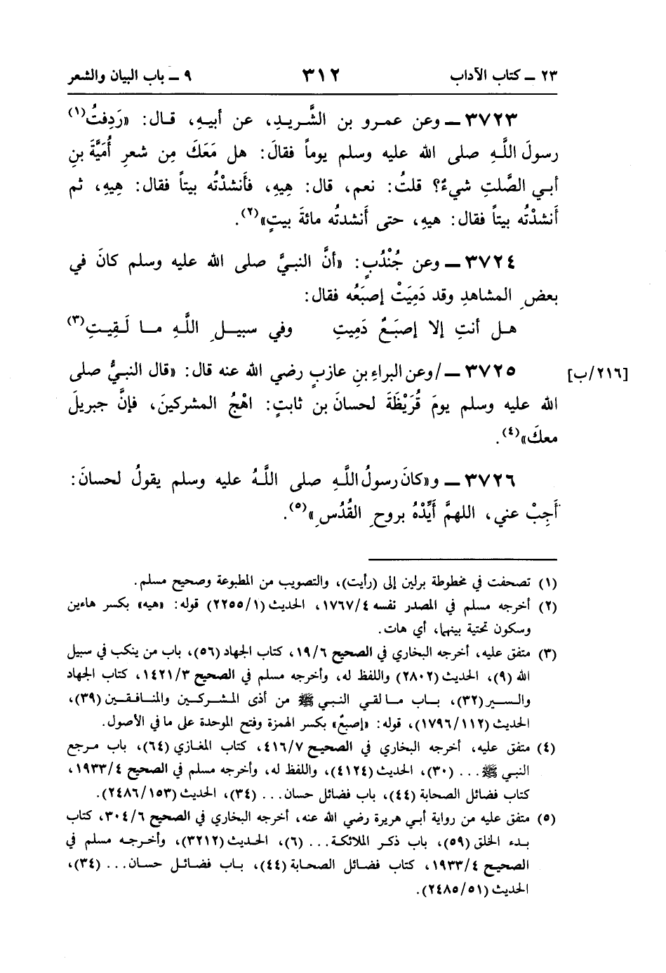 3726 - و"كانَ رسولُ اللَّهِ صلى اللَّهُ عليه وسلم يقولُ لحسانَ: أَجِبْ عني، اللَّهمَّ أَيِّدْهُ بروحِ القُدُسِ" (¬5).