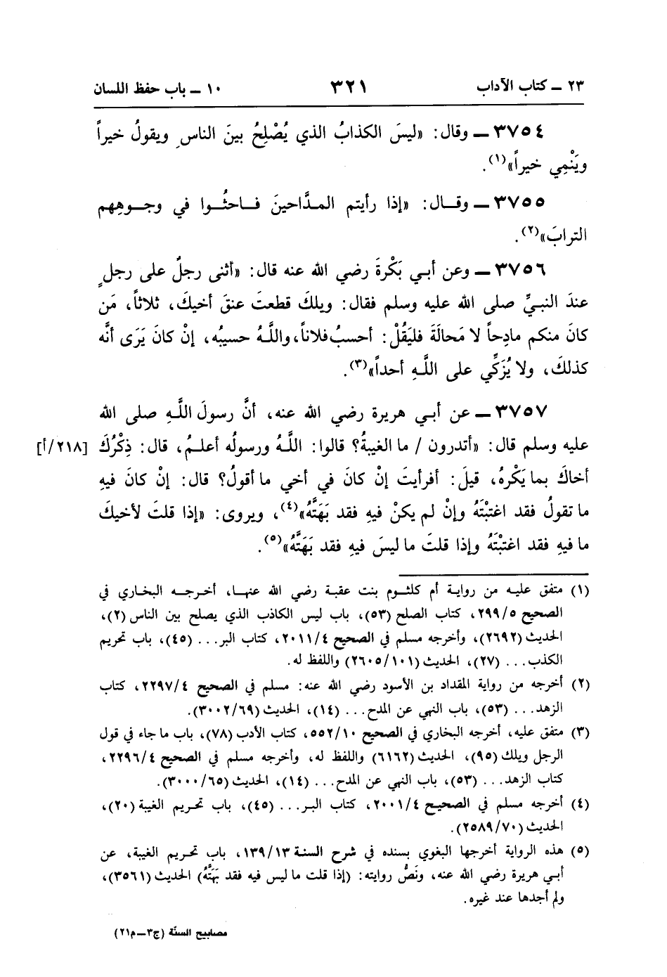 3756 - وعن أبي بَكْرةَ رضي اللَّه عنه قال: " أثنى رجلٌ على رجلٍ عندَ النَّبيّ صلى اللَّه عليه وسلم فقال: ويلكَ قطعتَ عنقَ أخيكَ، ثلاثًا، مَن كانَ منكم مادِحًا لا مَحالَةَ فليَقُلْ: أحسبُ فلانًا، واللَّهُ حسيبُه، إنْ كانَ يَرَى أنَّه كذلكَ، ولا يُزَكِّي على اللَّهِ أحدًا" (¬3).