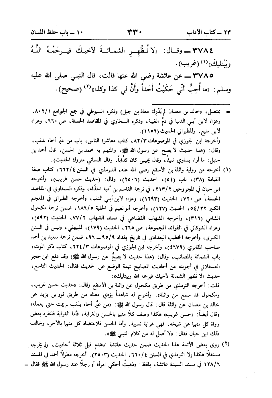 3785 - عن عائشة رضي اللَّه عنه قالت، قال النبي صلى اللَّه عليه وسلم: "ما أُحِبُّ أنّي حَكَيْتُ أَحَدًا وأَنَّ لي كذا وكذا" (¬2) (صحيح).