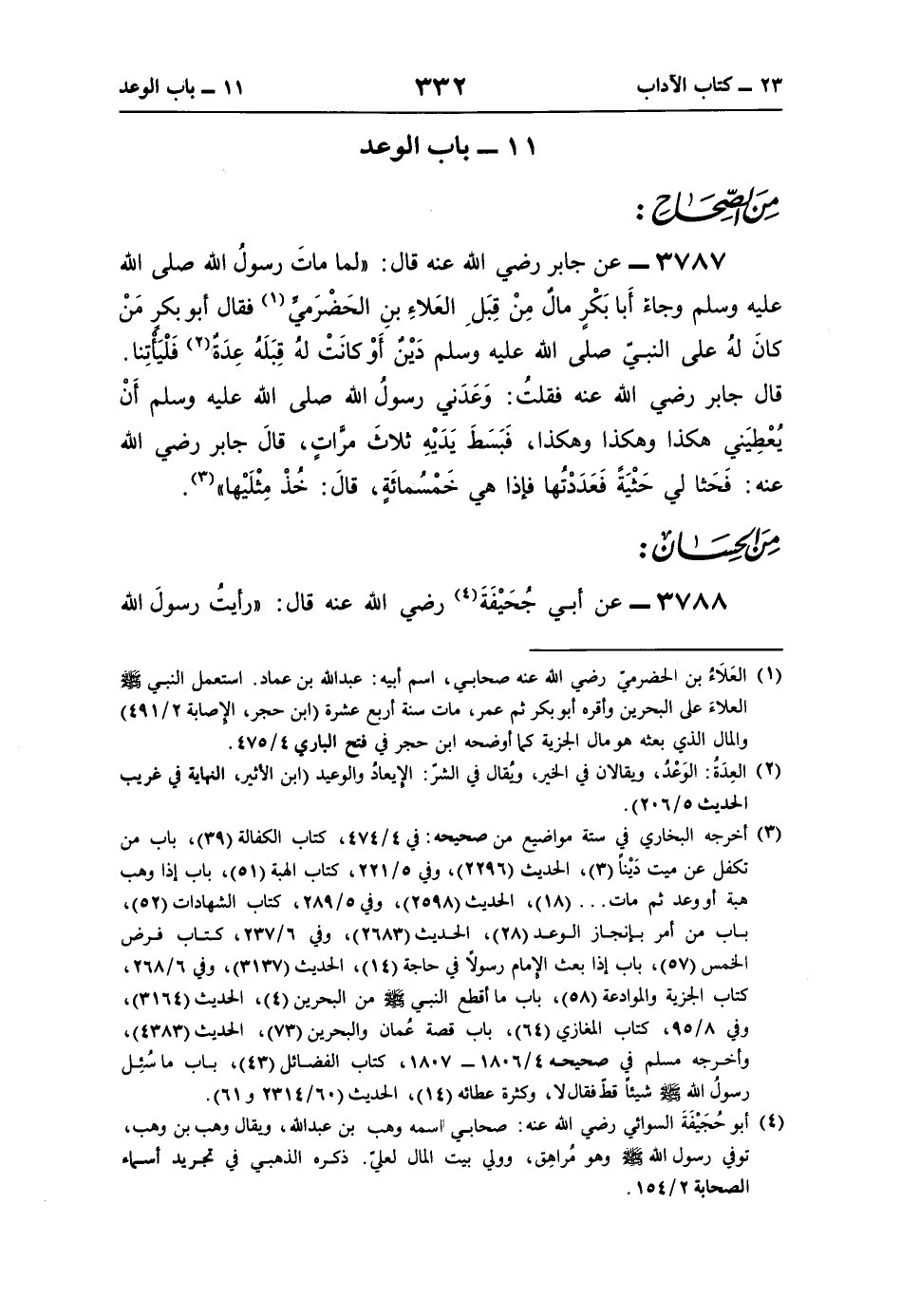 3787 - عن جابر رضي اللَّه عنه قال: "لما ماتَ رسولُ اللَّه صلى اللَّه عليه وسلم وجاء أَبا بَكْرٍ مالٌ مِنْ قِبَلِ العَلاءِ بنِ الحَضْرَميِّ (¬1) فقال أبو بكر مَنْ كانَ لهُ على النَّبيّ صلى اللَّه عليه وسلم دَيْنٌ أَوْ كانَتْ لهُ قِبَلَهُ عِدَةٌ (¬2) فَلْيأْتِنا. قال جابر رضي اللَّه عنه فقلتُ: وَعَدَني رسولُ اللَّه صلى اللَّه عليه وسلم أَنْ يُعْطِيَني هكذا وهكذا وهكذا، فَبَسَطَ يَدَيْهِ ثلاثَ مرَّاتٍ، قالَ جابر رضي اللَّه عنه: فَحَثا لي حَثْيَةً فَعَدَدْتُها فإذا هي خَمْسُمائَةٍ، قالَ: خُذْ مِثْلَيْها" (¬3).