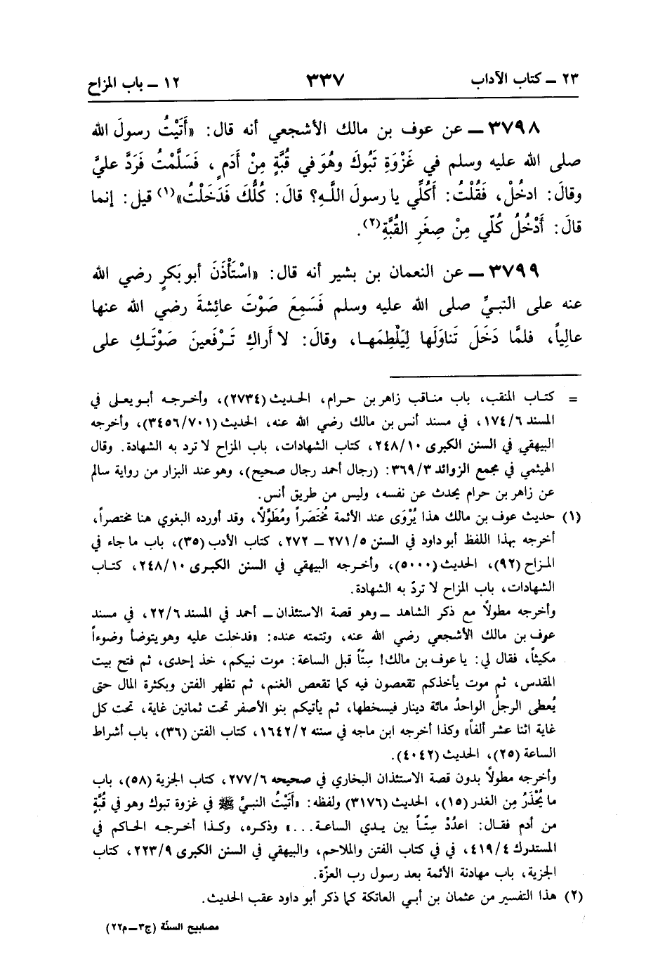 3798 - عن عوف بن مالك الأشجعي أنّه قال: "أَتَيْتُ رسولَ اللَّه صلى اللَّه عليه وسلم في غَزْوَةِ تَبُوكَ وهُوَ في قُبَّةٍ مِنْ أَدَمٍ، فَسَلَّمْتُ فَرَدَّ عليَّ وقالَ: ادخُلْ، فَقُلْتُ: أَكُلِّي يا رسولَ اللَّهِ؟ قالَ: كُلُّكَ فَدَخَلْتُ" (¬1) قيل: إنما قالَ: أَدْخُلُ كُلّي مِنْ صِغَرِ القُبَّةِ (¬2).