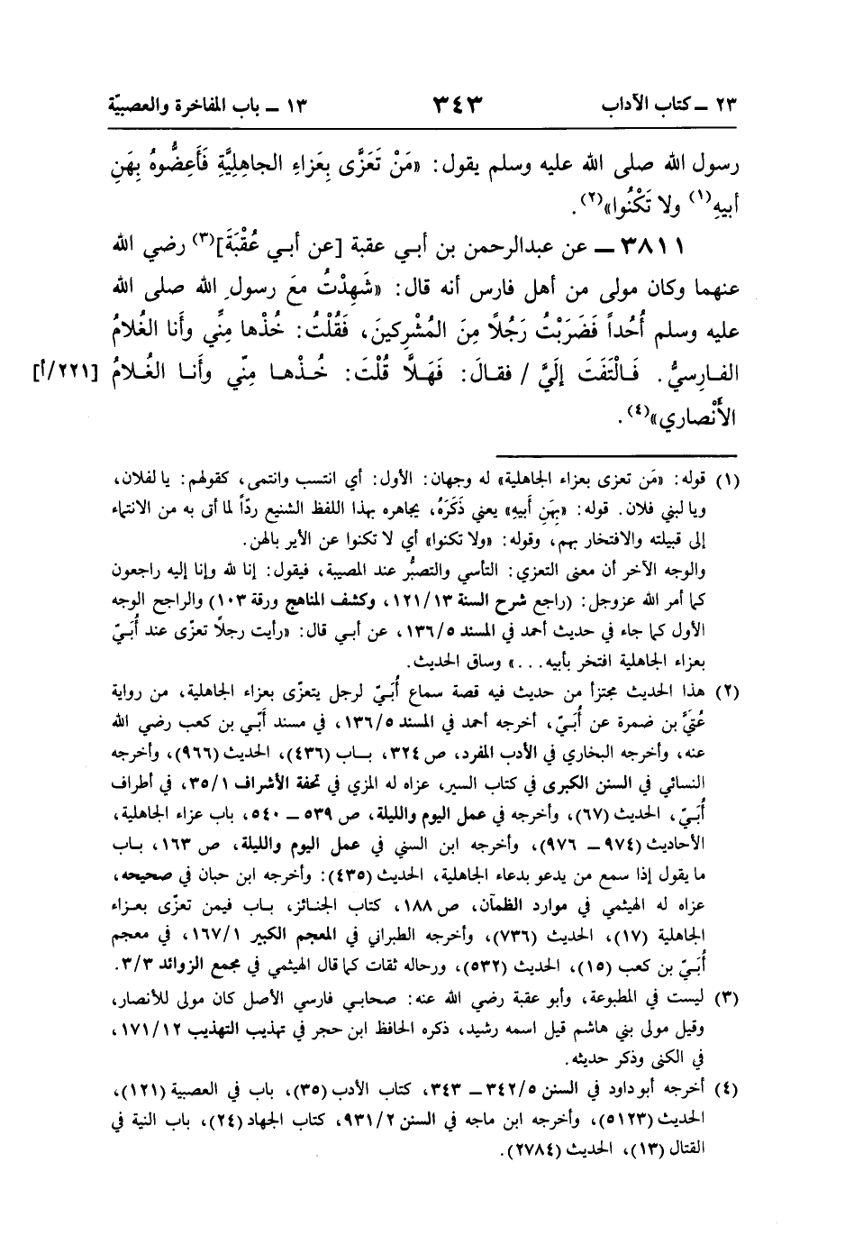 3811 - عن عبد الرحمن بن أبي عقبة [عن أبي عُقْبَةَ] (¬3) رضي اللَّه عنهما وكان مولى من أهل فارس أنّه قال: "شَهِدْتُ معَ رسولِ اللَّه صلى اللَّه عليه وسلم أُحُدًا فَضَرَبْتُ رَجُلًا مِنَ المُشْرِكينَ، فَقُلْتُ: خُذْها مِنِّي وأَنا الغُلامُ الفارِسيُّ. فَالْتَفَتَ إليَّ فقالَ: فَهَلَّا قُلْتَ: خُذْها مِنّي وأَنا الغُلامُ الأَنْصاري" (¬4).