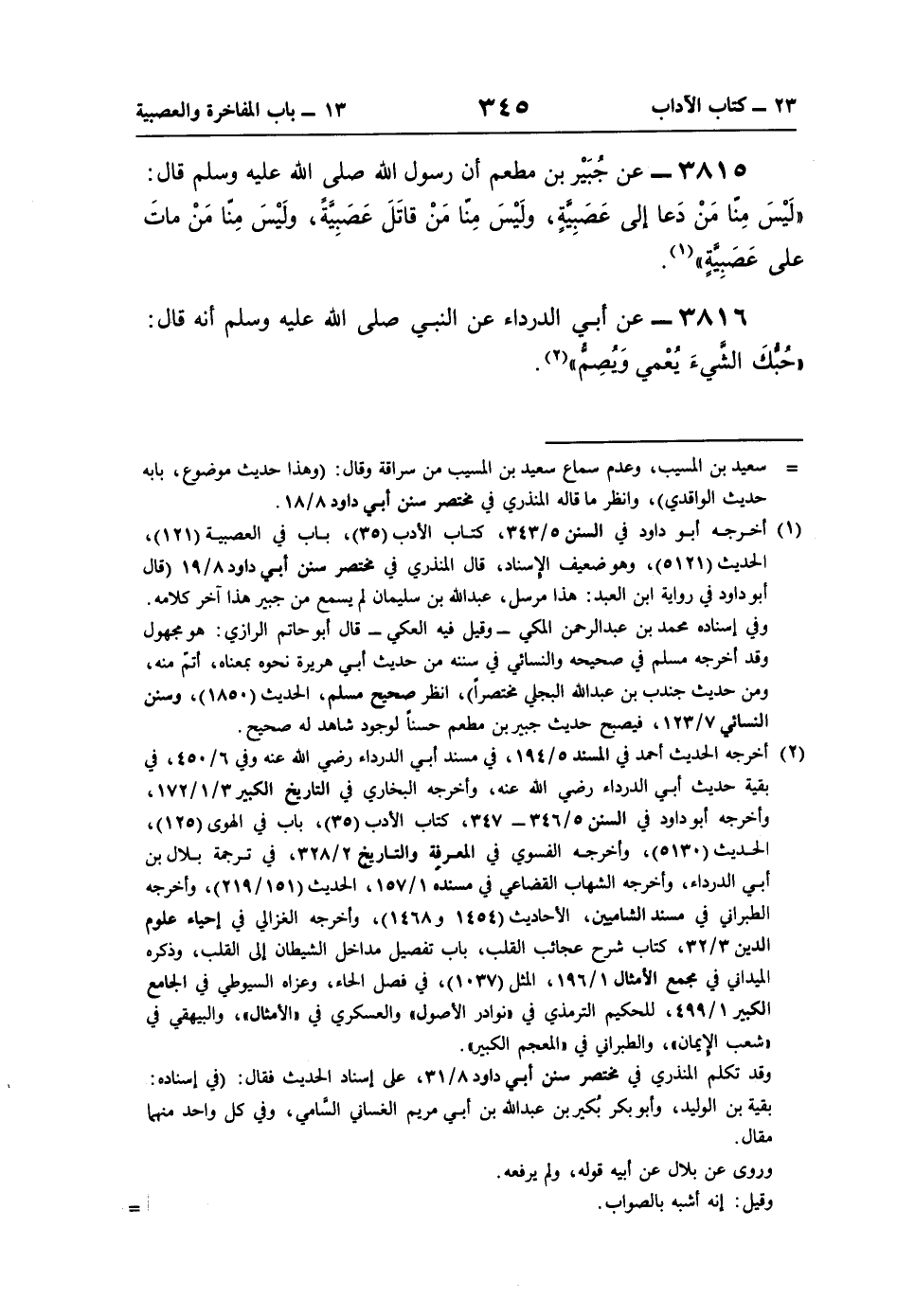 (¬1) أخرجه أبو داود في السنن 5/ 343، كتاب الأدب (35)، باب في العصبية (121)، الحديث (5121)، وهو ضعيف الإسناد، قال المنذري في مختصر سنن أبي داود 8/ 19 (قال أبو داود في رواية ابن العبد: هذا مرسل، عبد اللَّه بن سليمان لم يسمع من جبير هذا آخر كلامه. وفي إسناده محمد بن عبد الرحمن المكي -وقيل فيه العكي- قال أبو حاتم الرازي: هو مجهول وقد أخرجه مسلم في صحيحه والنسائي في سننه من حديث أبي هريرة نحوه بمعناه، أتمّ منه، ومن حديث جندب بن عبد اللَّه البجلي مختصرًا)، انظر صحيح مسلم، الحديث (1850)، وسنن النسائي 7/ 123، فيصبح حديث جبير بن مطعم حسنًا لوجود شاهد له صحيح.