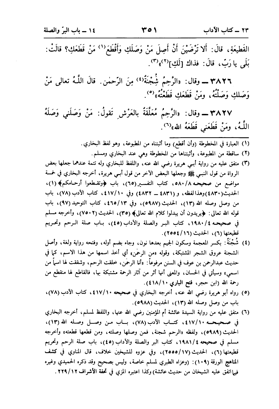 3827 - وقال: "الرَّحِمُ مُعَلَّقَةٌ بالعَرْشِ تَقولُ: مَنْ وَصَلَني وَصَلَهُ اللَّهُ، ومَنْ قَطَعَني قَطَعَهُ اللَّه" (¬6).
