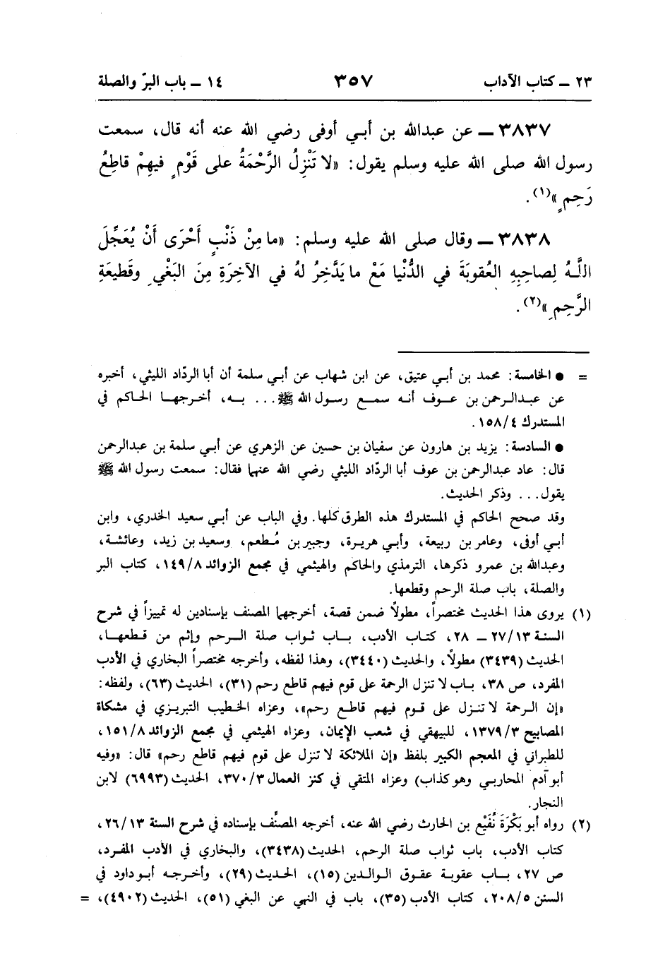 وقد صحح الحاكم في المستدرك هذه الطرق كلها. وفي الباب عن أبي سعيد الخدري، وابن أبي أوفى، وعامر بن ربيعة، وأبي هريرة، وجبير بن مُطعم، وسيد بن زيد، وعائشة، وعبد اللَّه بن عمرو ذكرها، الترمذي والحاكم والهيثمي في مجمع الزوائد 8/ 149، كتاب البر والصلة، باب صلة الرحم وقطعها.