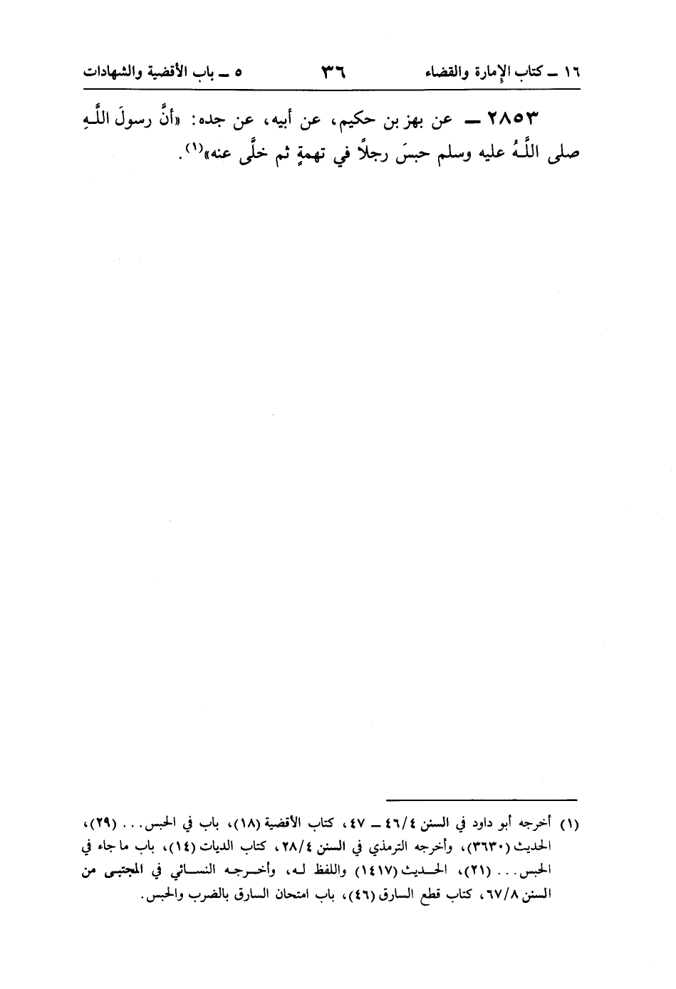 2853 - عن بهز بن حكيم، عن أبيه، عن جده: "أنَّ رسولَ اللَّهِ صلى اللَّهُ عليه وسلم حبسَ رجلًا في تهمةٍ ثم خلَّى عنه" (¬1).