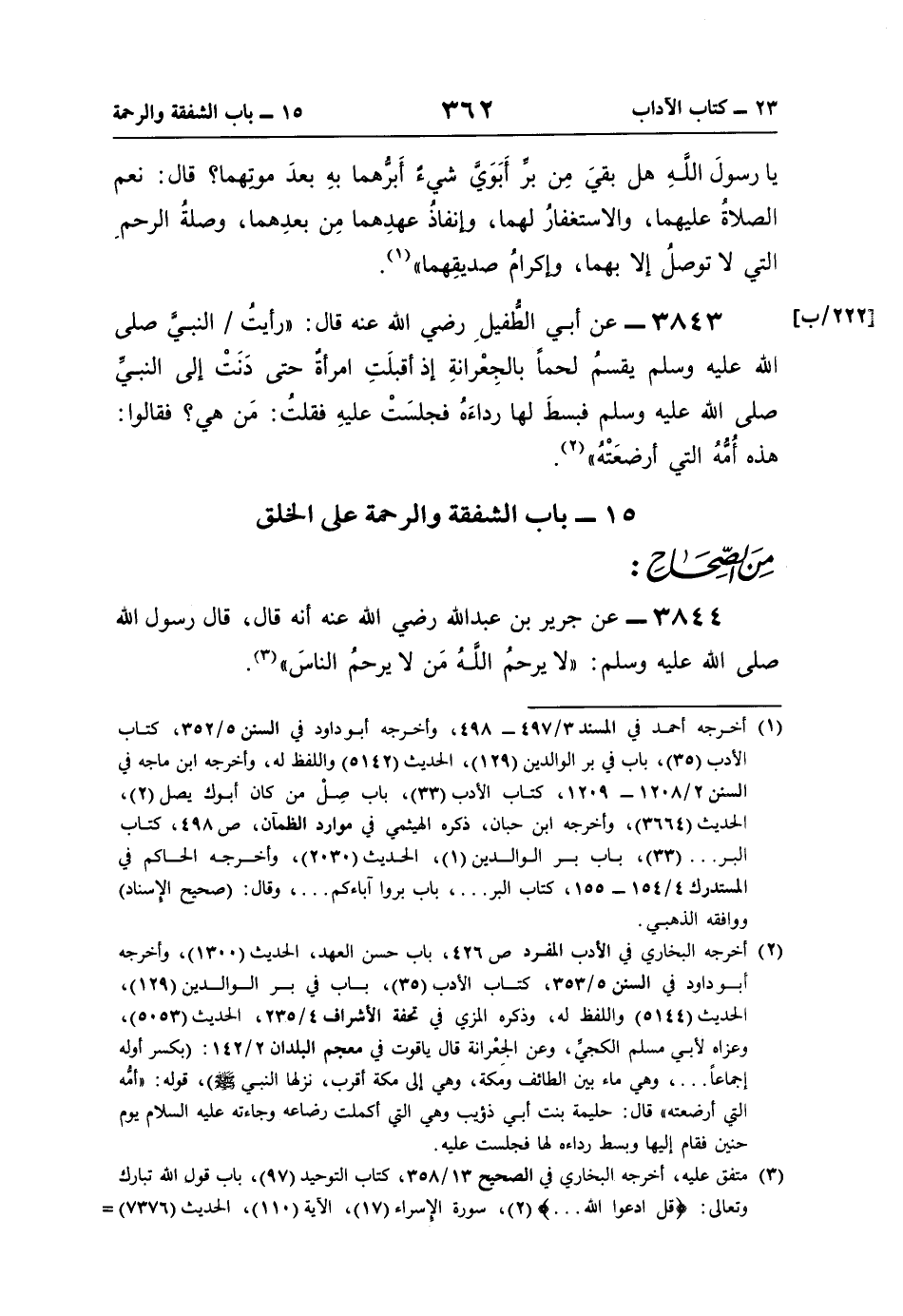 3844 - عن جرير بن عبد اللَّه رضي اللَّه عنه أنّه قال، قال رسول اللَّه صلى اللَّه عليه وسلم: "لا يرحمُ اللَّهُ مَن لا يرحمُ الناسَ" (¬3).