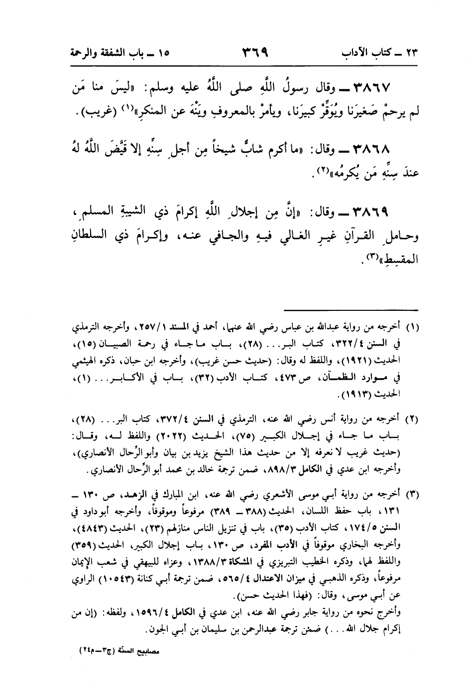 (¬3) أخرجه من رواية أبي موسى الأشعري رضي اللَّه عنه، ابن المبارك في الزهد، ص 130 - 131، باب حفظ اللسان، الحديث (388 - 389) مرفوعًا وموقوفًا، وأخرجه أبو داود في السنن 5/ 174، كتاب الأدب (35)، باب في تنزيل الناس منازلهم (23)، الحديث (4843)، وأخرجه البخاري موقوفًا في الأدب المفرد، ص 130، باب إجلال الكبير، الحديث (359) واللفظ لهما، وذكره الخطيب التبريزي في المشكاة 3/ 1388، وعزاه للبيهقي في شعب الإيمان مرفوعًا، وذكره الذهبي في ميزان الاعتدال 4/ 565، ضمن ترجمة أبي كنانة (10543) الراوي عن أبي موسى، وقال: (فهذا الحديث حسن).