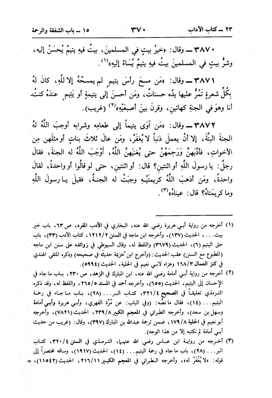 (¬2) أخرجه من رواية أبي أمامة رضي اللَّه عنه، ابن المبارك في الزهد، ص 230، باب ما جاء في الإحسان إلى اليتيم، الحديث (655)، وأخرجه أحمد في المسند 5/ 265، واللفظ له، وقد ذكره الترمذي تعليقًا في الصحيح 1/ 324، كتاب البر. . . (28)، باب ما جاء في رحمة اليتيم. . . (14)، فقال ما نصُّه: (وفي الباب: عن مُرَّة الفهري، وأبي هريرة وأبي أمامة وسهل بن سعد)، وأخرجه الطبراني في المعجم الكبير 8/ 239، الحديث (7821)، وأخرجه أبو نعيم في الحلية 8/ 179، ضمن ترجمة عبد اللَّه بن المبارك (397)، وقال: (غريب من حديث أبي أمامة لم نكتبه إلّا من هذا الوجه).