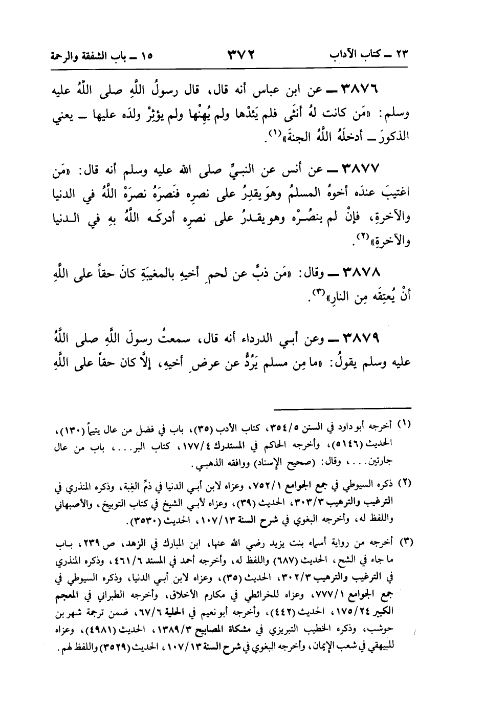 3878 - وقال: "مَن ذبَّ عن لحمِ أخيهِ بالمغيبَةِ كانَ حقًّا على اللَّهِ أنْ يُعتِقَه مِن النَّارِ" (¬3).
