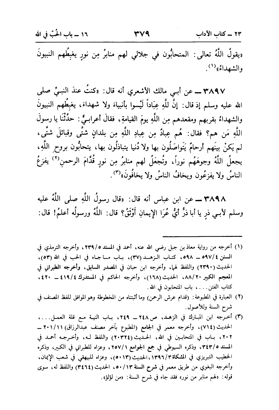 3897 - عن أبي مالك الأشعري أنّه قال: "كنتُ عندَ النَّبيِّ صلى اللَّه عليه وسلم إذ قال: إنَّ للَّهِ عِبَادًا لَيْسوا بأنبياءَ ولا شهداءَ، يغبِطُهم النبيونَ والشهداءُ بقربهم ومقعدهم مِن اللَّهِ يومَ القيامةِ، فقالَ أعرابيٌّ: حدِّثْنَا يا رسولَ اللَّهِ مَن هم؟ فقال: هُم عِبادٌ مِن عِبادِ اللَّهِ مِن بلدانٍ شتَّى وقبائلَ شتَّى، لم يَكنْ بينَهم أرحامٌ يَتَواصَلُون بها ولا دُنيا يتباذلُون بها، يتحابُّون بروحِ اللَّهِ، يجعل اللَّهُ وجوهَهم نورًا، وتُجعَلُ لهم منابرُ مِن نورٍ قُدَّامَ الرحمنِ (¬2) يفزعُ النَّاسُ ولا يفزعُون ويخافُ النَّاسُ ولا يخافُونَ" (¬3).