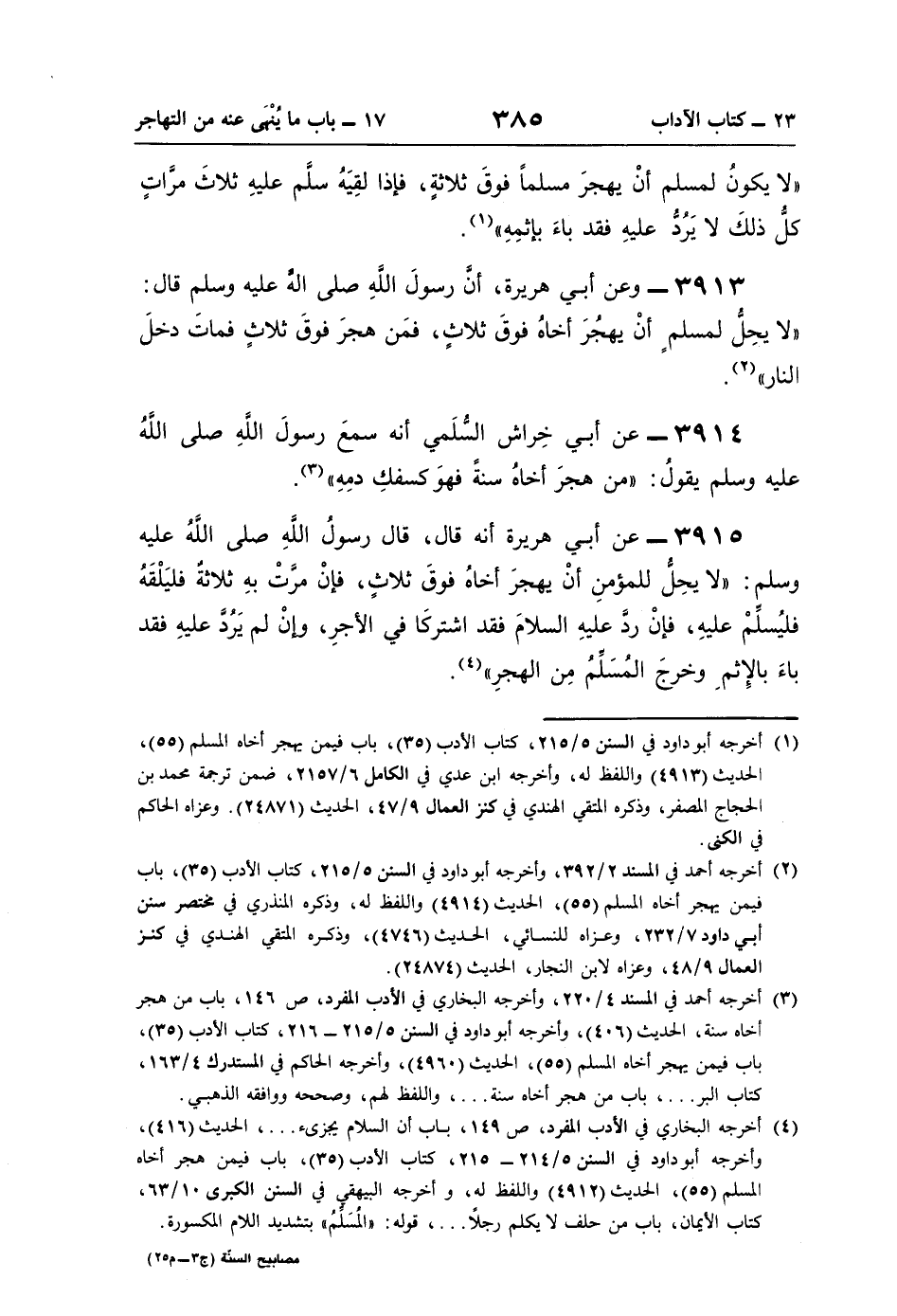 3914 - عن أبي خِراش السُّلَمي أنه سمعَ رسولَ اللَّهِ صلى اللَّهُ عليه وسلم يقولُ: "من هجرَ أخاهُ سنةً فهوَ كسفكِ دمِهِ" (¬3).
