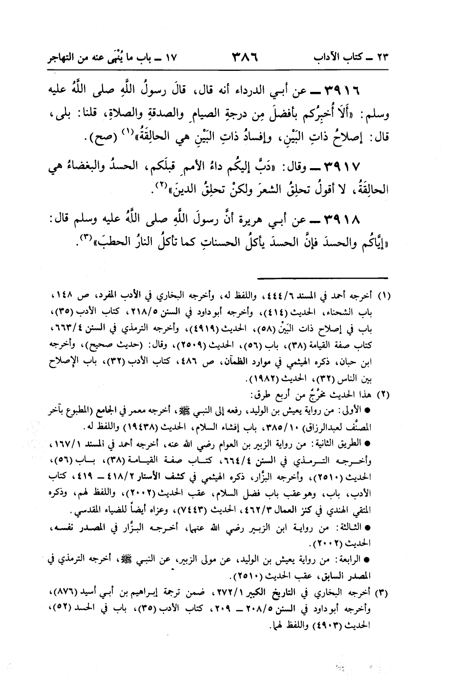 3917 - وقال: "دَبَّ إليكم داءُ الأممِ قبلَكم، الحسدُ والبغضاءُ هي الحالِقَةُ، لا أقول تحلِقُ الشعرَ ولكنْ تحلِقُ الدينَ" (¬2).