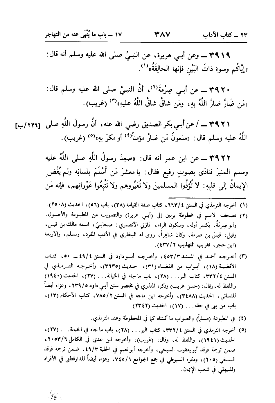 3921 - عن أبي بكر الصديق رضي اللَّه عنه، أنَّ رسولَ اللَّهِ صلى اللَّهُ عليه وسلم قال: "ملعونٌ مَن ضارَّ مؤمنًا (¬4) أو مكرَ بهِ" (¬5) (غريب).
