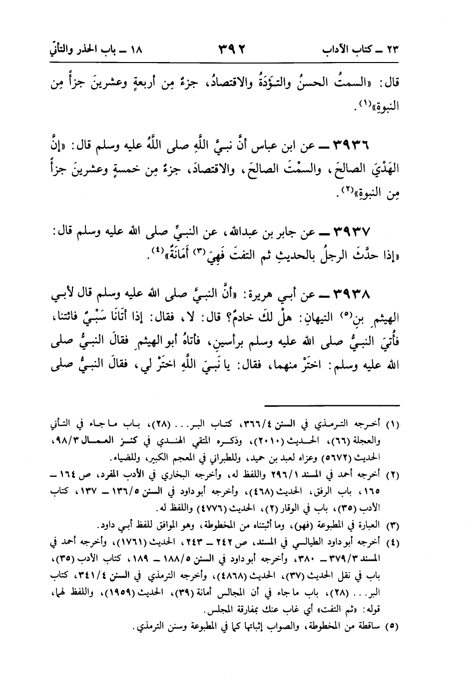 (¬4) أخرجه أبو داود الطيالسي في المسند، ص 242 - 243، الحديث (1761)، وأخرجه أحمد في المسند 3/ 379 - 380، وأخرجه أبو داود في السنن 5/ 188 - 189، كتاب الأدب (35)، باب في نقل الحديث (37)، الحديث (4868)، وأخرجه الترمذي في السنن 4/ 341، كتاب البر. . . (28)، باب ما جاء في أن المجالس أمانة (39)، الحديث (1959)، واللفظ لهما، قوله: "ثم التفت" أي غاب عنك بمفارقة المجلس.