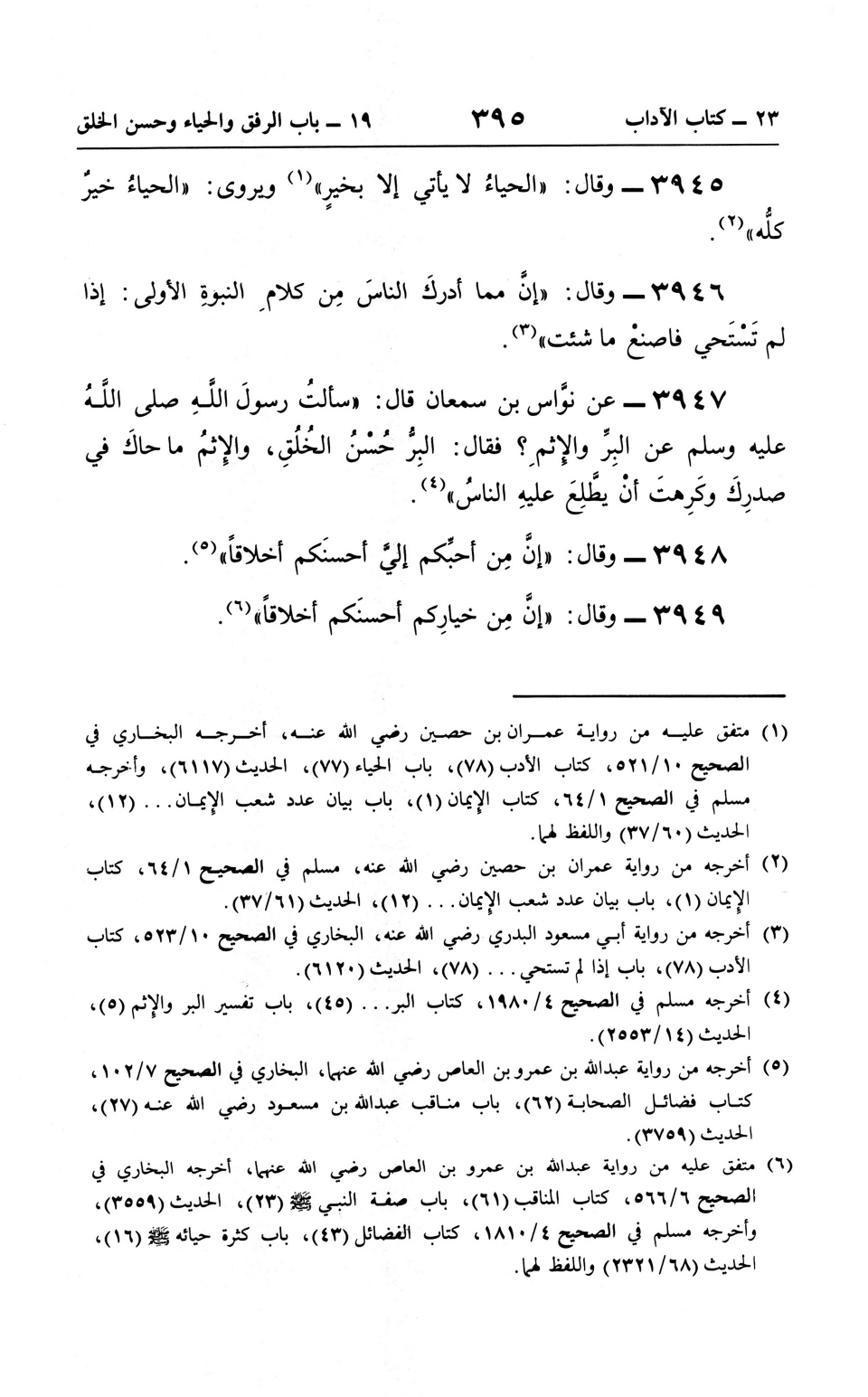 3947 - عن نواس بن سمعان قال: "سألتُ رسولَ اللَّهِ صلى اللَّهُ عليه وسلم عن البِرِّ والإِثمِ؟ فقال: البِرُّ حُسْنُ الخُلُقِ، والإثمُ ما حاكَ في صدرِكَ وكَرِهتَ أنْ يطَّلِعَ عليهِ النَّاسُ" (¬4).