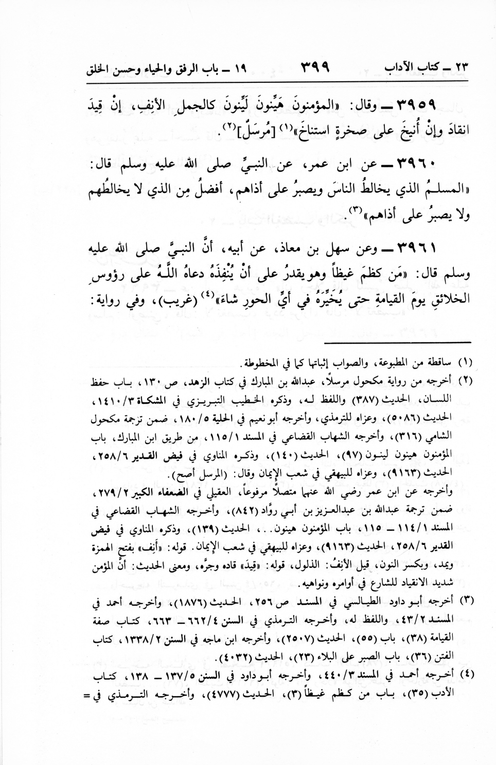 3960 - عن ابن عمر، عن النَّبيِّ صلى اللَّه عليه وسلم قال: "المسلمُ الذي يخالط الناسَ ويصبر على أذاهم، أفضلُ مِن الذي لا يخالطُهم ولا يصبرُ على أذاهم" (¬3).