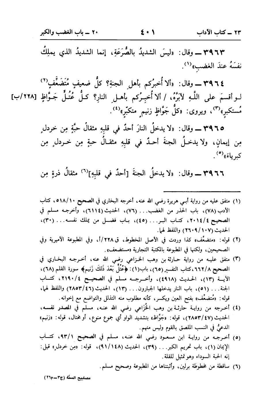 (¬5) أخرجه من رواية ابن مسعود رضي اللَّه عنه، مسلم في الصحيح 1/ 93، كتاب الإيمان (1)، باب تحريم الكبر. . . (39)، الحديث (148/ 91)، قوله: "مِن خردلٍ" قيل: إنه الحبة السوداء وهو تمثيل للقلة.
