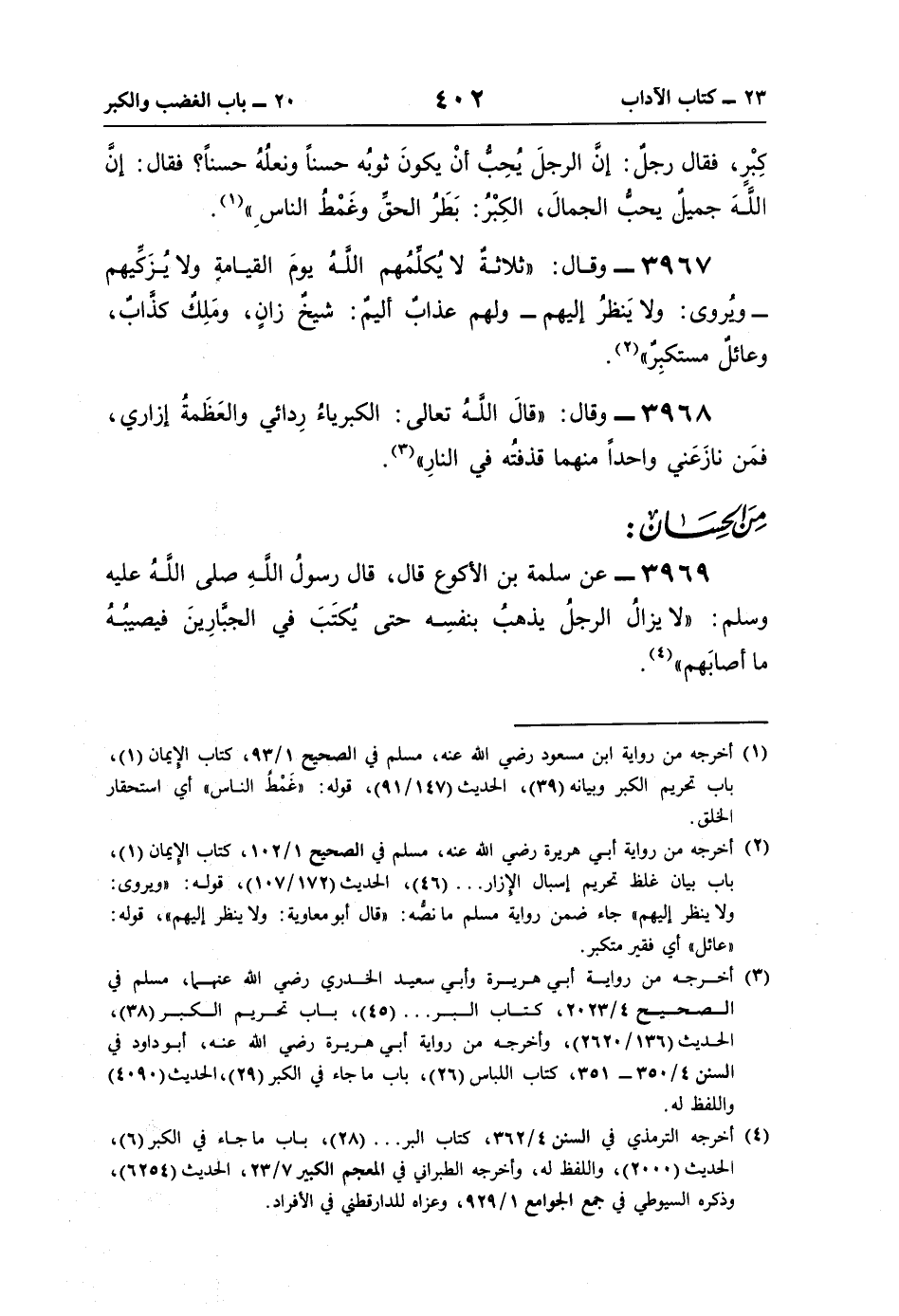 (¬3) أخرجه من رواية أبي هريرة وأبي سعيد الخدري رضي اللَّه عنهما، مسلم في الصحيح 4/ 2023، كتاب البر. . . (45)، باب تحريم الكبر (38)، الحديث (136/ 2620)، وأخرجه من رواية أبي هريرة رضي اللَّه عنه، أبو داود في السنن 4/ 350 - 351، كتاب اللباس (26)، باب ما جاء في الكبر (29)، الحديث (4090) واللفظ له.