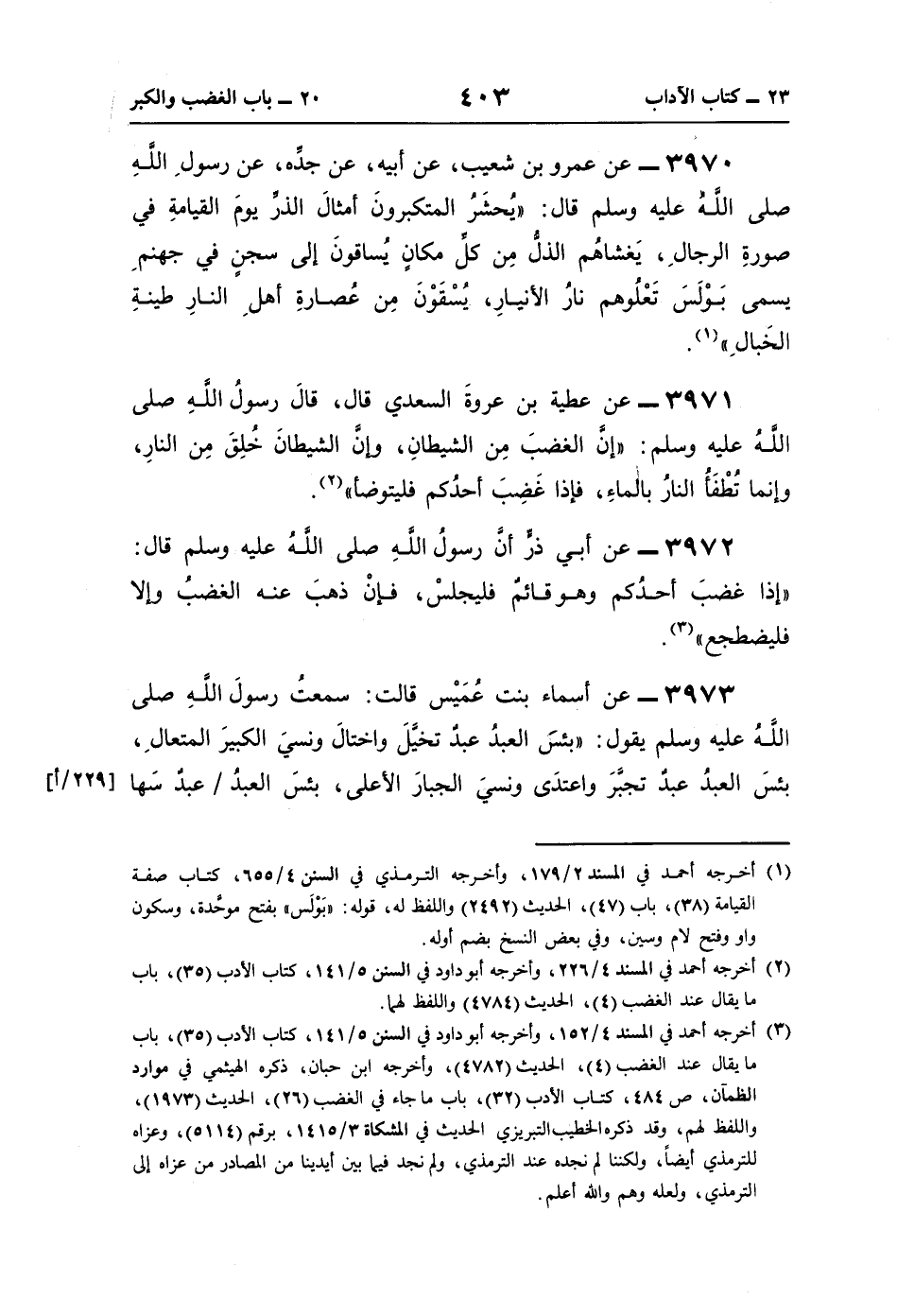3972 - عن أبي ذرٍّ أنَّ رسولُ اللَّهِ صلى اللَّهُ عليه وسلم قال: "إذا غضبَ أحدُكم وهو قائمٌ فليجلسْ، فإنْ ذهبَ عنه الغضبُ وإلا فليضطجع" (¬3).