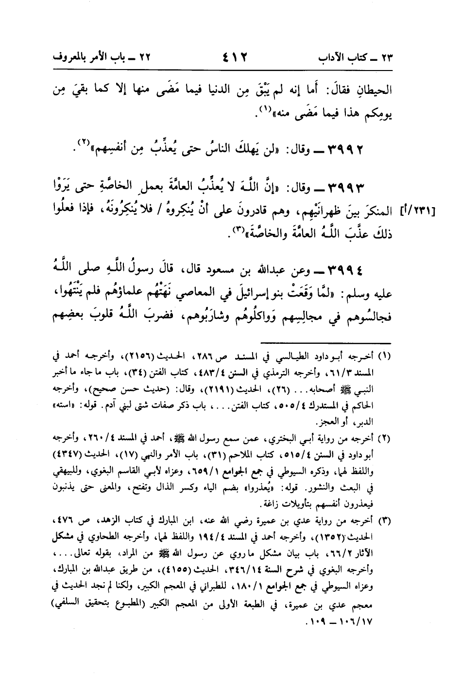 (¬2) أخرجه من رواية أبي البختري، عمن سمع رسول اللَّه -صلى اللَّه عليه وسلم-، أحمد في المسند 4/ 260، وأخرجه أبو داود في السنن 4/ 515، كتاب الملاحم (31)، باب الأمر والنهي (17)، الحديث (4347) واللفظ لها، وذكره السيوطي في جمع الجوامع 1/ 659، وعزاه لأبي القاسم البغوي، وللبيهقي في البعث والنشور. قوله: "يُعذروا" بضم الياء وكسر الذال وتفتح، والمعنى حتَّى يذنبون فيعذرون أنفسهم بتأويلات زاغة.