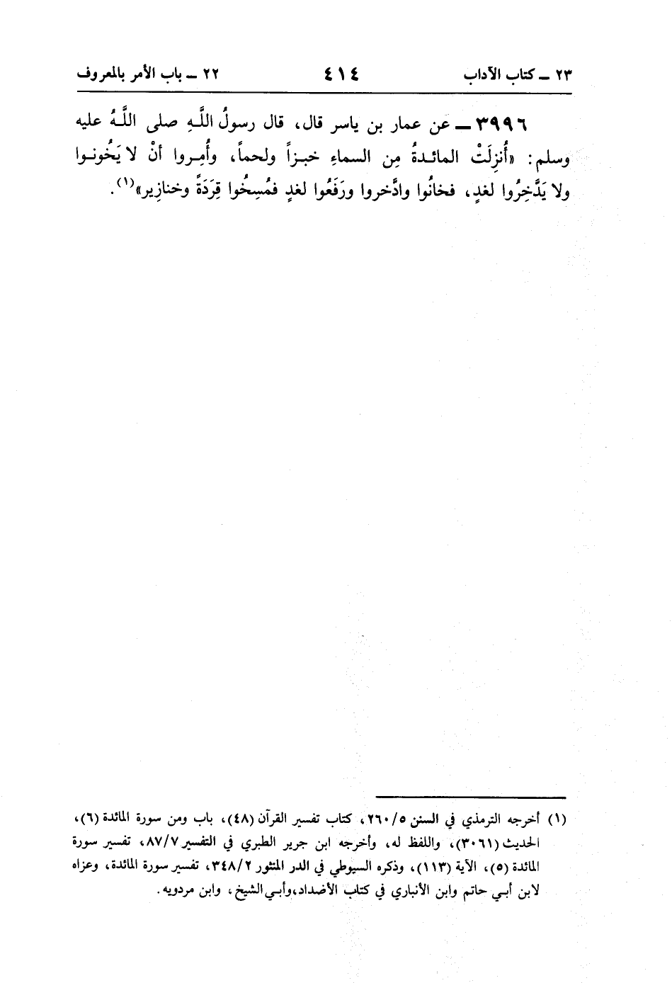 3996 - عن عمار بن ياسر قال، قال رسول اللَّهِ صلى اللَّهُ عليه وسلم: "أُنزِلَتْ المائدةُ مِن السماءِ خبزًا ولحمًا، وأُمِروا أنْ لا يَخُونوا ولا يَدَّخِرُوا لغدٍ، فخانُوا وادَّخروا ورَفَعُوا لغدٍ فمُسِخُوا قِرَدَةً وخنازِير" (¬1).