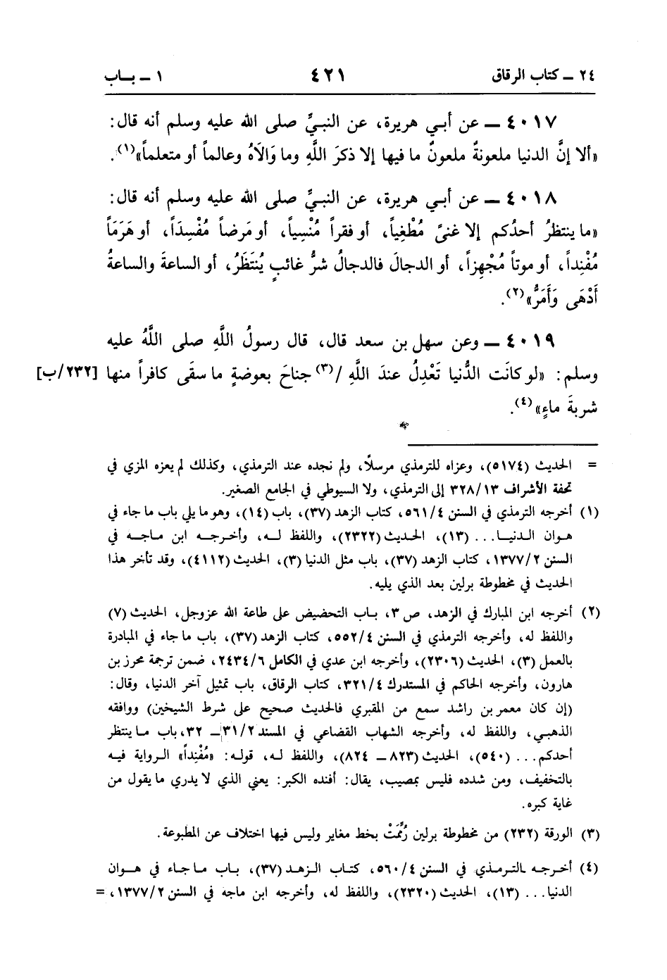 (¬1) أخرجه الترمذي في السنن 4/ 561، كتاب الزهد (37)، باب (14)، وهو ما يلي باب ما جاء في هوان الدنيا. . . (13)، الحديث (2322)، واللفظ له، وأخرجه ابن ماجه في السنن 2/ 1377، كتاب الزهد (37)، باب مثل الدنيا (3)، الحديث (4112)، وقد تأخر هذا الحديث في مخطوطة برلين بعد الذي يليه.