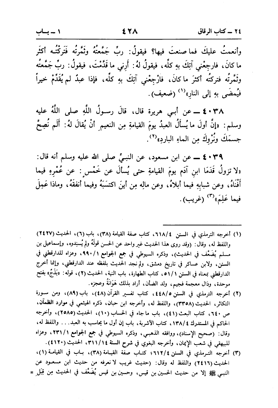(¬2) أخرجه الترمذي في السنن 5/ 448، كتاب تفسير القرآن (48)، باب (89)، ومن سورة التكاثر، الحديث (3358)، واللفظ له، وأخرجه ابن حبان، ذكره الهيثمي في موارد الظمآن، ص 640، كتاب البعث (41)، باب ما جاء في الحساب (10)، الحديث (2585)، وأخرجه الحاكم في المستدرك 4/ 138، كتاب الأشربة، باب إن أول ما يحاسب به العبد. . . واللفظ له، وقال: (صحيح الإسناد)، ووافقه الذهبي، وذكره السيوطي في جمع الجوامع 1/ 231، وعزاه للبيهقي في شعب الإيمان، وأخرجه البغوي في شرح السنة 14/ 311، الحديث (4120).