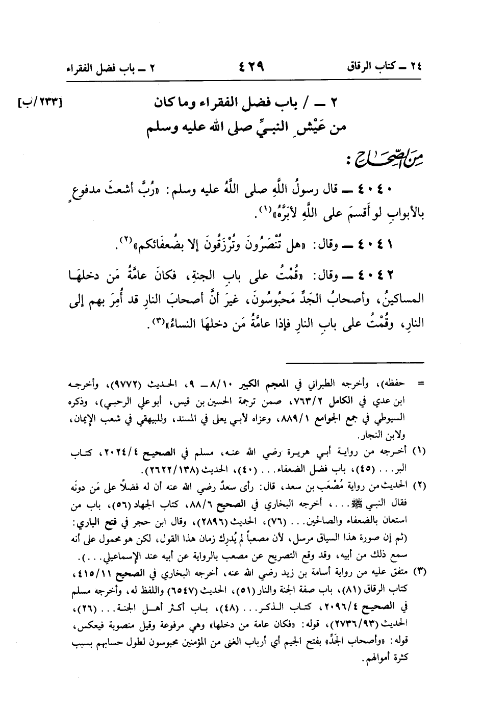 (¬1) أخرجه من رواية أبي هريرة رضي اللَّه عنه، مسلم في الصحيح 4/ 2024، كتاب البر. . . (45)، باب فضل الضعفاء. . . (40)، الحديث (138/ 2622).