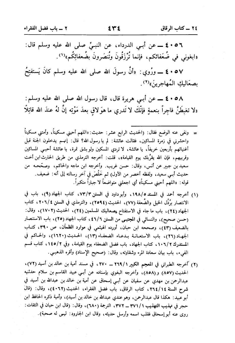 = ونفى عنه الوضع فقال: (الحديث الرابع عشر: حديث: "اللهم أحيني مسكينًا، وأمتني مسكينًا واحشرني في زمرة المساكين، فقالت عائشة: لم يا رسول اللَّه؟ قال: إنهم يدخلون الجنة قبل أغنيائهم بأربعين خريفًا، يا عائشة، لا تردي المسكين ولو بشق تمرة، يا عائشة أحبي المساكين وقربيهم، فإن اللَّه يقرِّبك يوم القيامة"، قلت: أخرجه الترمذي من طريق الحارث ابن أخت سعيد بن جبير عن أنس، وقال: حسن غريب. وأخرجه ابن ماجه والحاكم، وصحّحه من حديث أبي سعيد، ولفظه أخصر من الأول) ثم خَلُصَ في آخر رسالته إلى أنه: ضعيف. قوله: "اللهم أحيني مسكينًا" أي اجعلني متواضعًا لا جبارًا متكبرًا.