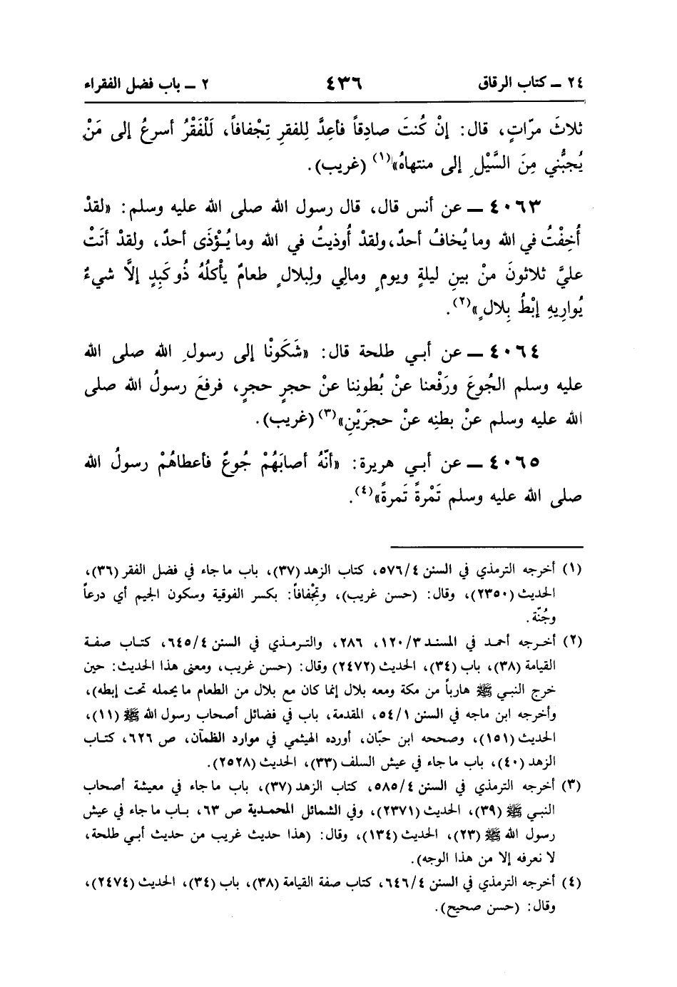 (¬3) أخرجه الترمذي في السنن 4/ 585، كتاب الزهد (37)، باب ما جاء في معيشة أصحاب النبي -صلى اللَّه عليه وسلم- (39)، الحديث (2371)، وفي الشمائل المحمدية ص 63، باب ما جاء في عيش رسول اللَّه -صلى اللَّه عليه وسلم- (23)، الحديث (134)، وقال: (هذا حديث غريب من حديث أبي طلحة، لا نعرفه إلّا من هذا الوجه).