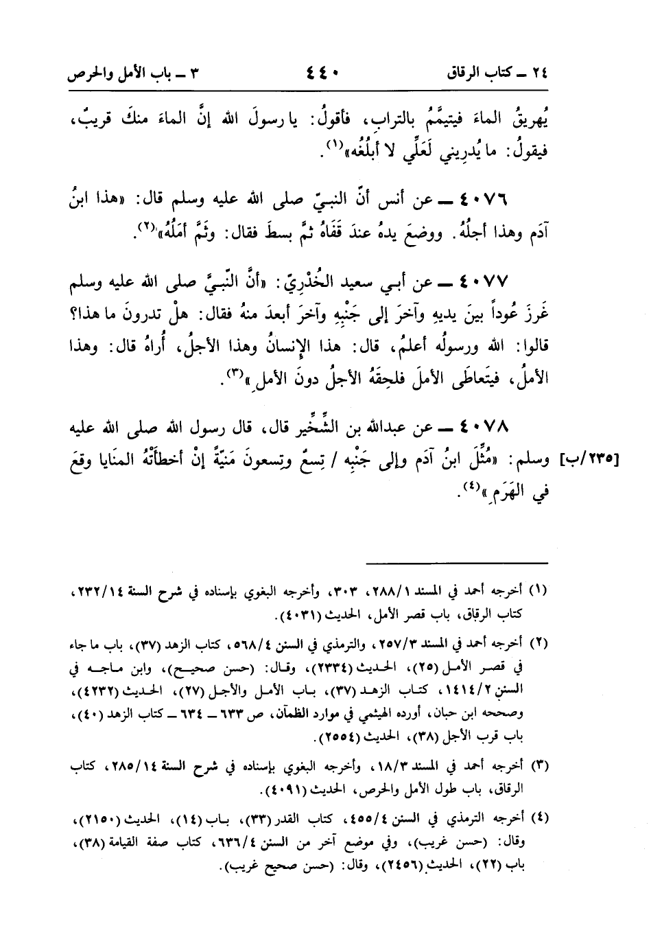 4076 - عن أنس أنّ النَّبيّ صلى اللَّه عليه وسلم قال: "هذا ابنُ آدَم وهذا أجلُهُ. ووضعَ يدهُ عندَ قَفَاهُ ثمَّ بسطَ فقال: وثَمَّ أمَلُهُ" (¬2).
