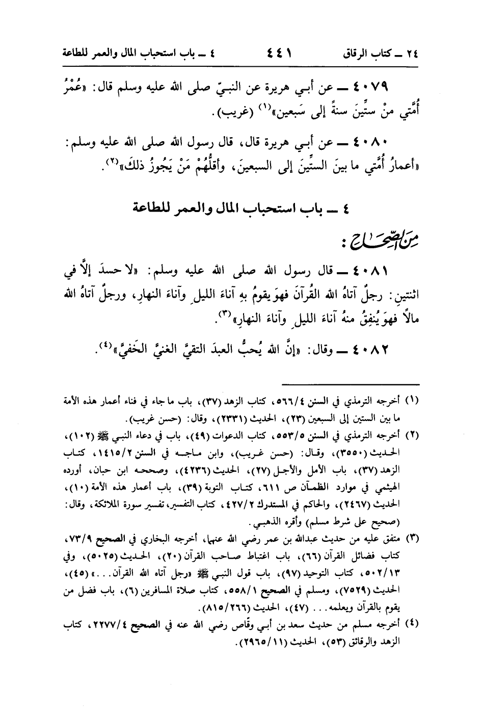 4081 - قال رسول اللَّه صلى اللَّه عليه وسلم: "لا حسدَ إلَّا في اثنتينِ: رجلٌ آتاهُ اللَّه القرآنَ فهوَ يقومُ بهِ آناءَ الليلِ وآناءَ النهارِ، ورجلٌ آتاهُ اللَّه مالًا فهوَ يُنفِقُ منهُ آناءَ الليلِ وآناءَ النهارِ" (¬3).