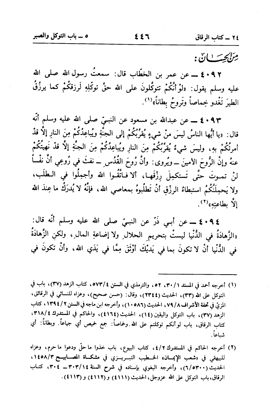 (¬2) أخرجه الحاكم في المستدرك 2/ 4، كتاب البيوع، باب خذوا ما حلّ ودعوا ما حرم، وعزاه للبيهقي في "شعب الإيمان" الخطيب التبريزي في مشكاة المصابيح 3/ 1458، الحديث (5300/ 6)، وأخرجه البغوي بإسناده في شرح السنة 14/ 303 - 304، كتاب الرقاق، باب التوكل على اللَّه عزَّ وجلَّ، الحديث (4111) و (4112) و (4113).