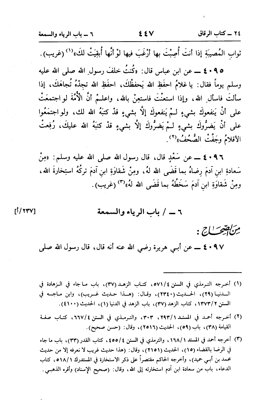 4096 - عن سَعْدٍ قال، قال رسول اللَّه صلى اللَّه عليه وسلم: "مِنْ سَعادةِ ابنِ آدمَ رِضاهُ بما قَضَى اللَّه لهُ، ومِنْ شَقاوَةِ ابنِ آدمَ تركُهُ استِخارةَ اللَّه، ومِنْ شَقاوَةِ ابنِ آدمَ سَخَطُهُ بما قَضَى اللَّه لهُ" (¬3) (غريب).