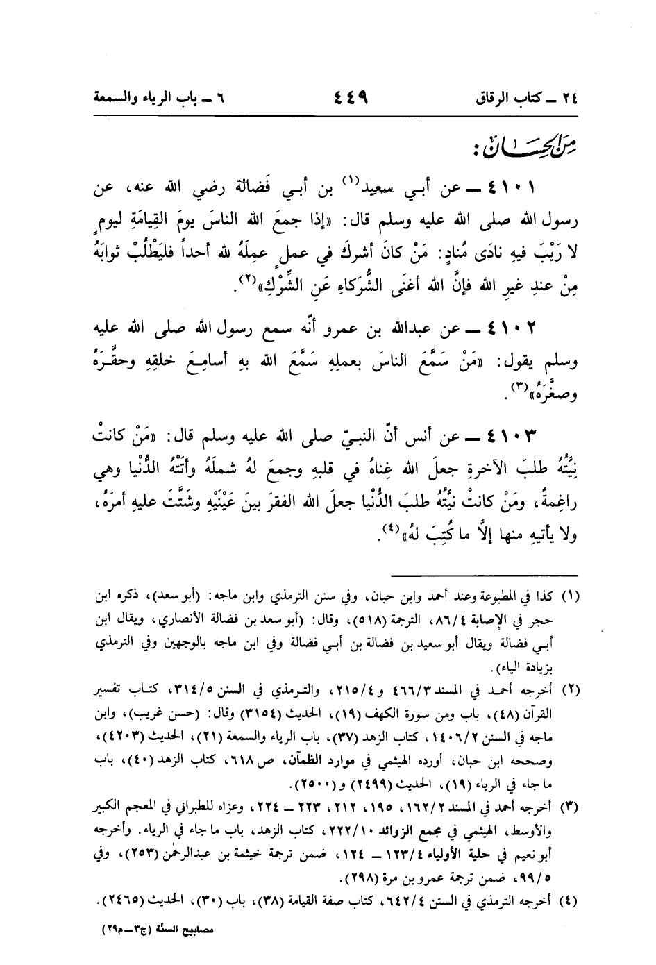 4102 - عن عبد اللَّه بن عمرو أنَّه سمع رسول اللَّه صلى اللَّه عليه وسلم يقول: "مَنْ سَمَّعَ الناسَ بعملِهِ سَمَّعَ اللَّه بهِ أسامِعَ خلقِهِ وحقَّرَهُ وصغَّرَهُ" (¬3).