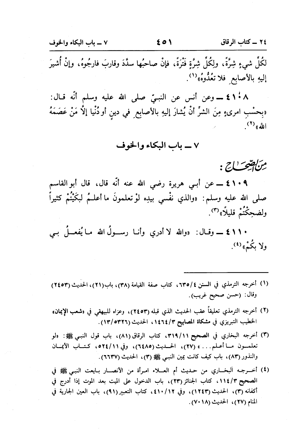 4109 - عن أبي هريرة رضي اللَّه عنه أنّه قال، قال أبو القاسم صلى اللَّه عليه وسلم: "والذي نفْسي بيدِه لوْ تعلمونَ ما أعلمْ لبكَيْتمْ كثيرًا ولضحِكْتُمْ قليلًا" (¬3).