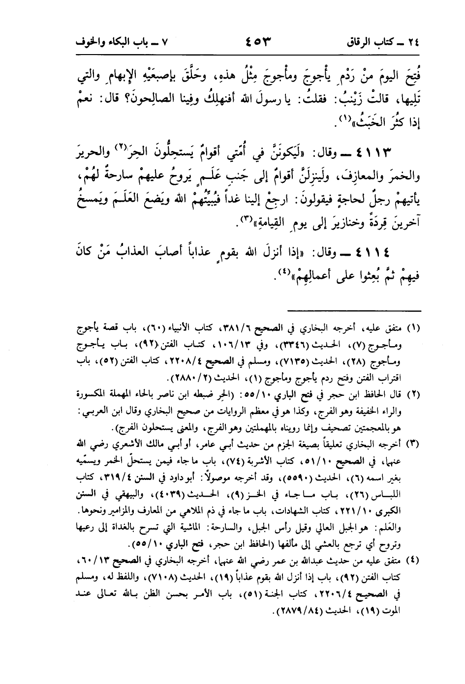 (¬2) قال الحافظ ابن حجر في فتح الباري 10/ 55: (الحِر ضبطه ابن ناصر بالحاء المهملة المكسورة والراء الخفيفة وهو الفرج، وكذا هو في معظم الروايات من صحيح البخاري وقال ابن العربي: هو بالمعجمتين تصحيف وإنما رويناه بالمهملتين وهو الفرج، والمعنى يستحلون الفرج).
